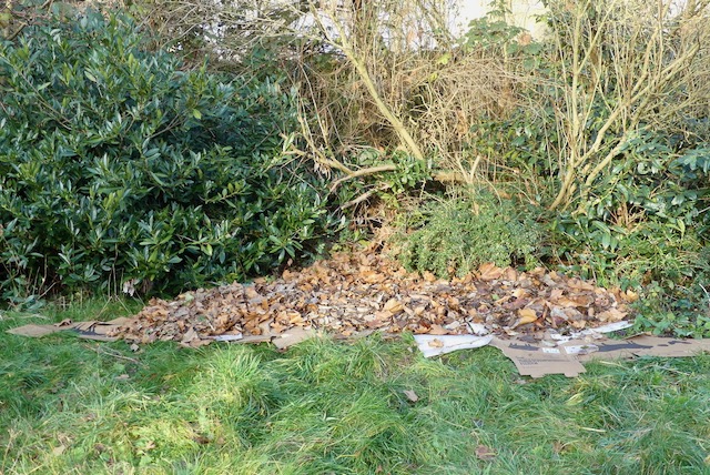 Morgens: Weil es noch sonnig war, habe ich noch eine Schicht Laub aus dem schattigen Hof gekratzt und auf den Pappen verteilt.