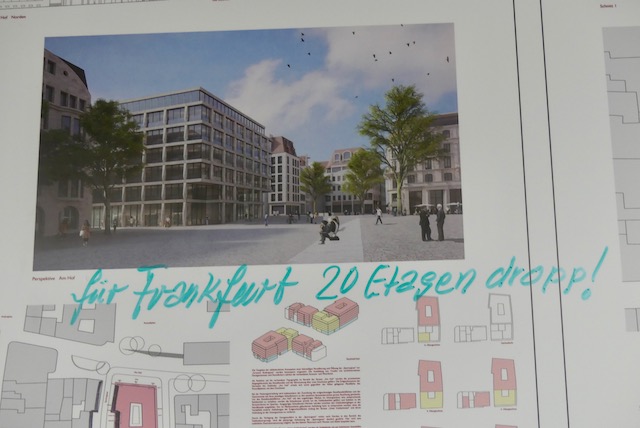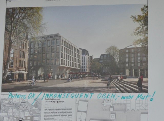 Gegenüber hängen Entwürfe für einen geplanten Neubau der Domumgebung. Jemand hat mit grünem Stift kommentiert.