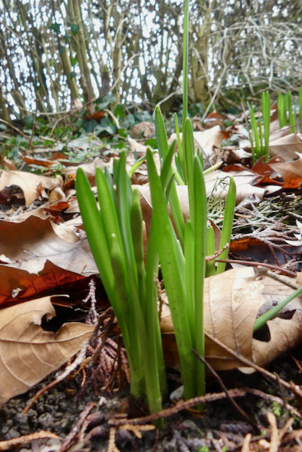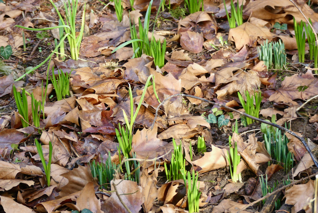 Ist ja spannend, da ich nicht weiß, was ich da eigentlich gepflanzt habe. Es waren Narzissen, ein paar Hyazinthen, irgendwelche gekeimten Zwiebeln aus dem Kompost. Die Schneeglöckchen standen schon immer da, sind aber noch sehr zurückhaltend. Gut wächst der Knoblauch, der gleich nach dem Kauf gekeimt war und dem ich eine Chance im Beet gegeben hatte.