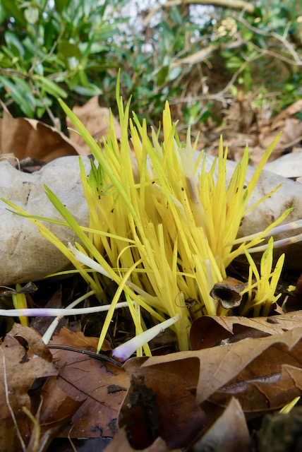 Durch Pappe, Hanf und Laubschicht machen sich Krokusse den Weg frei. Kann auch noch nichct lange her sein, denn sie sind noch ganz gelb. Ohne Licht, vergeilen Pflanzen und sehen erstmal zu, dass sie nach oben kommen.