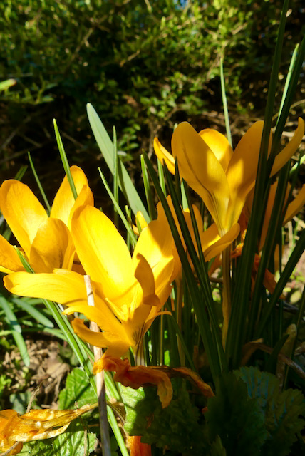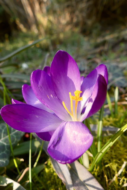 Nach den wilden, blühen die zahmen Krokusse. Auch Tulpen zeigen schon Blatt, aber noch keine Blüte.
