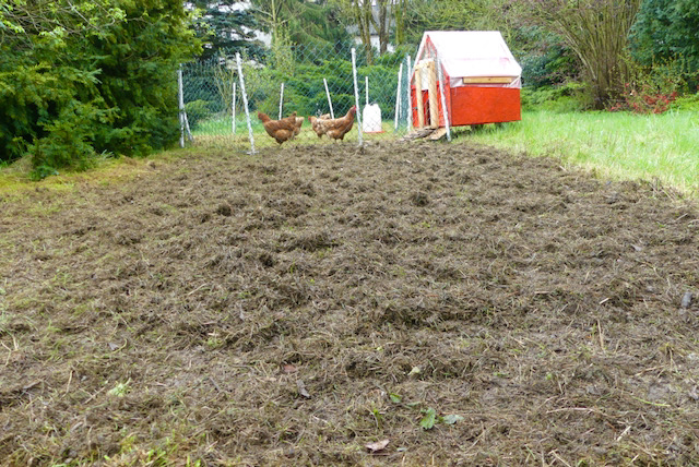 Das sieht jetzt schlimmer aus, als es ist. Obendrauf liegt eine lockere Schicht aus dreckigem Moos und darunter keimt schon etwas. Ich habe Samen bestellt und wenn die kommen, kommt das dreckige Moos auf den Kompost und die Samen da hin. Es macht aber auch jetzt schon klar, dass ich mir keine eigenen Hühner anschaffen werde.