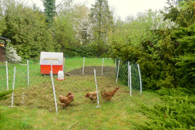 An einer Stelle scheint der Maschendraht beschädigt zu sein. Ich sichere die Stelle noch mit einem Häring. Natürlich meint das verfressene rotbraune Huhn, es gäbe was zu fressen und „hilft“ indem es auf dem Häring und meinem Daumen rumpickt.