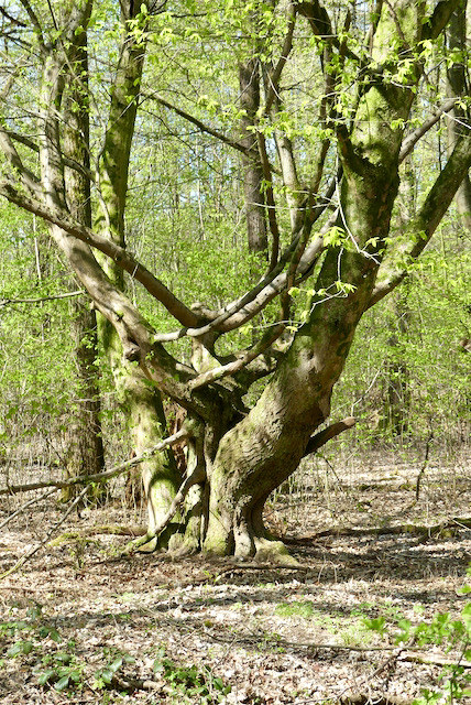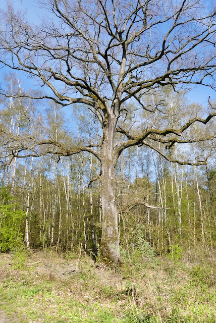 Die alten Hudeeichen stehen überall verstreut in der Wahner Heide. Gleich daneben ist eine umgekippt. Da sie nicht quer über den Weg gefallen ist, bleibt sie auch einfach liegen und ist schon ganz eingewachsen.