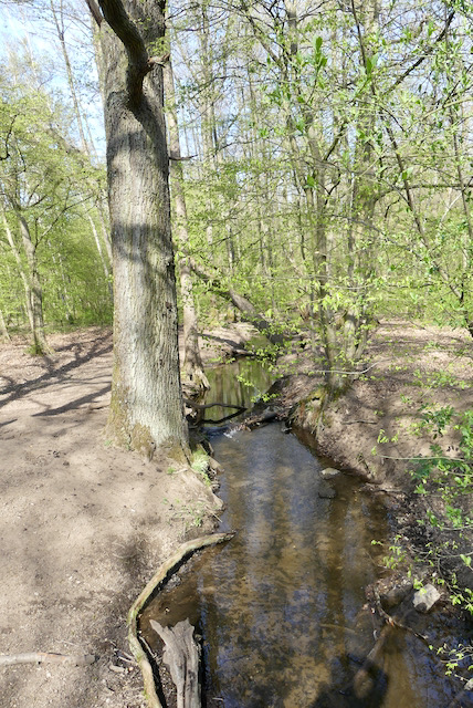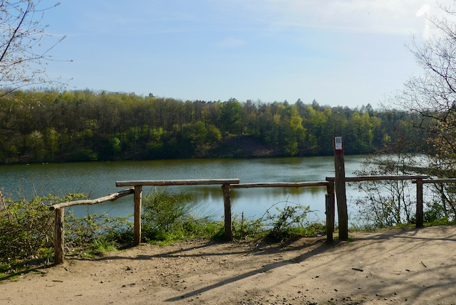 Nach der Überquerung des Kurtenwaldbachs geht es rechts am Pionierbecken vorbei. Dabei entgehen mir zwei Aussichtspunkte. Denn hier weicht der Track von der Wanderroute aus dem Buch „Wahner Heide, die 9 Rundwanderwege“ von Holger Maria Sticht ab.