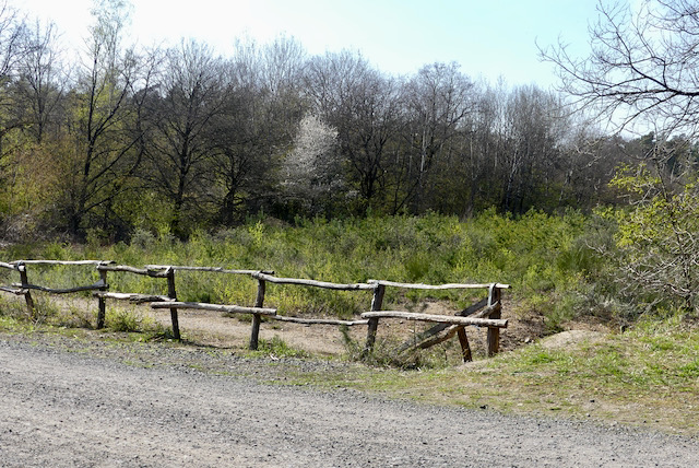 Bei der ehemaligen Panzer-Verladerampe mache ich Pause im Windschatten eines Holzstapels. Fichte mit Borkenschäden, geschält. Bis hier habe ich auf der ganzen Wanderung keine einzige Fichte gesehen. Eichen, Kiefern, Buche, Hainbuche, ja, aber keine Fichte. Die Naturschützer haben schon vor geraumer Zeit angefangen, alles zu entfernen, was hier nicht hingehört. Erst kurz vor Schluss komme ich an einem düsteren Fichtenbestand vorbei. Die Verladerampe wurde renaturiert und auf ihr sprießen jetzt junge Birken und Kiefern.