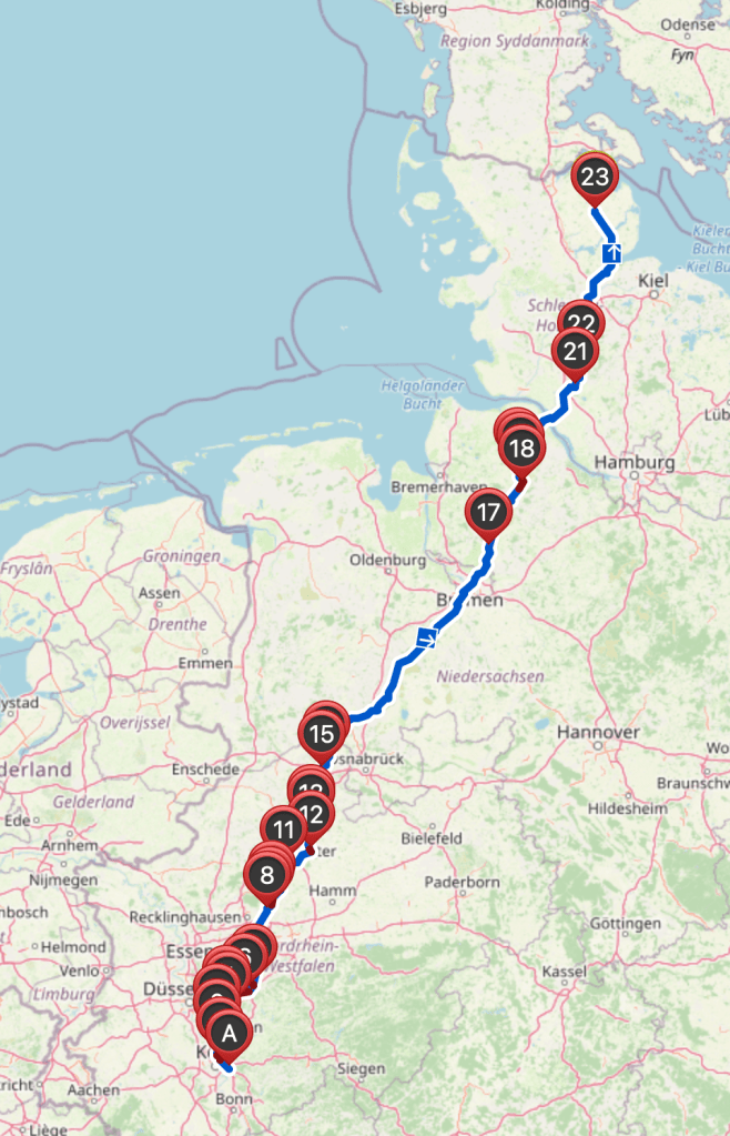 Eine schöne Radreise, meinem Alter und dem alten Rad entsprechend flach, über alte Bahntrassen, am Kanal entlang, mit wenig Steigung, nur am Anfang und in der Holsteinischen Schweiz. 600km in 12 Tagen zu fahren + 3 Extratage für Pausen, Besichtigungen und Pleiten, Pech und Pannen.