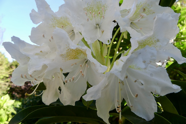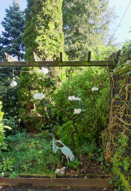 Der Rhododendron, den ich geschnitten hatte blüht wieder. Links liegt Grasmulch.
