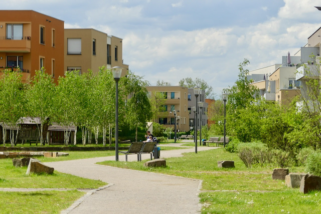 Denn durch die ganze Waldbadsiedlung schlängelt sich ein autofreier Grünzug mit vielen kleinen Spielplätzen.
