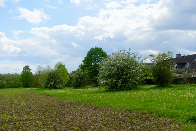 Der Grünzug endet am Zaun zum Waldbad Vingst. wo ich links abbiege und über die mir bekannte Hubbelpiste zwischen Einfamilien-Reihenhäusern und einem Gehölzstreifen zurückgehe.