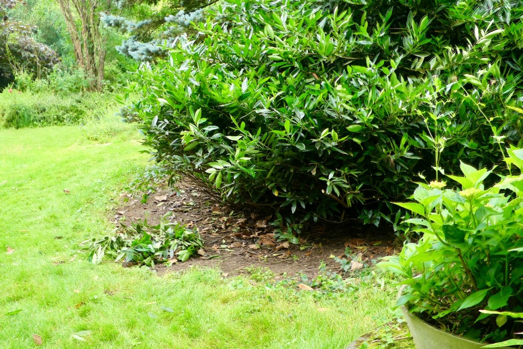 Der Starkregen der letzten Tage, hat die langen Gräser auf der Wiese platt gedrückt und der Kirschlorbeer ist in die Länge geschossen und hat sich ebenfalls etwas niedergelegt.