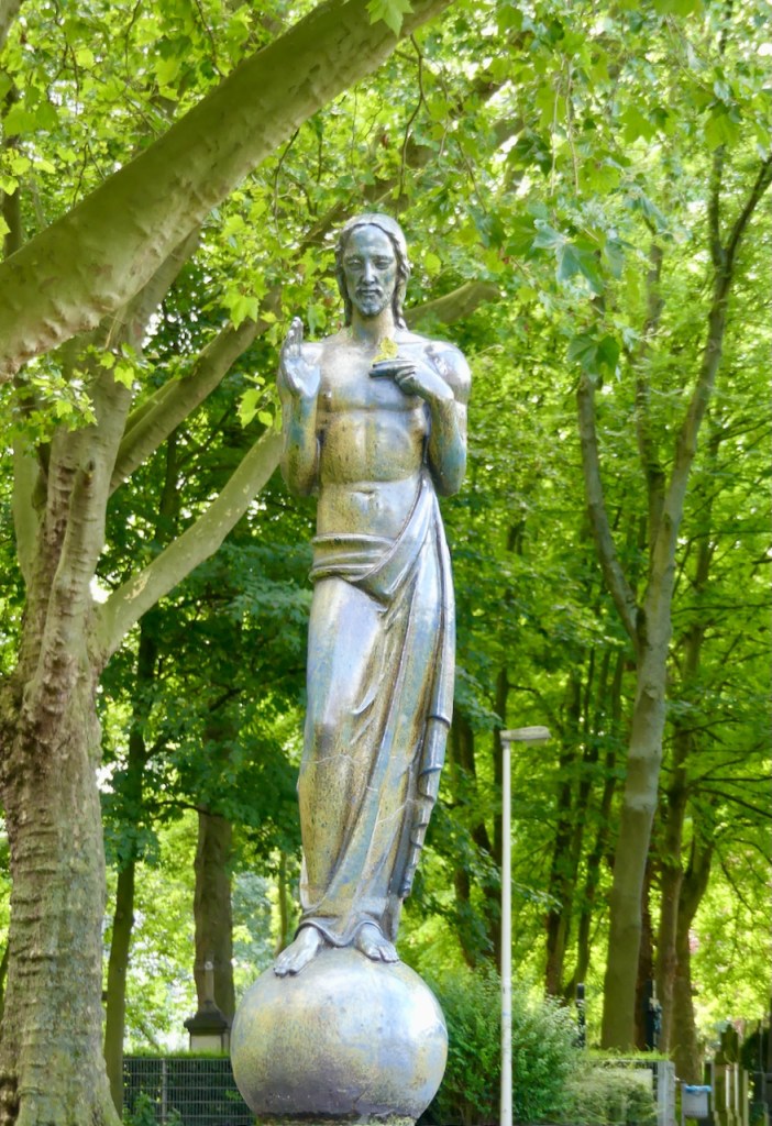 Ich wüsste ja gern wer da Modell gestanden hat. Mit leicht asiatischen Gesichtszügen, das Laken sehr locker um die Hüften geschwungen, steht er vor der Kirche in Frechen. Er schaut nicht so leidend, ernst und verhärmt aus der Wäsche wie die anderen Jesusse, die ich noch aus meiner katholischen Kindheit kenne.