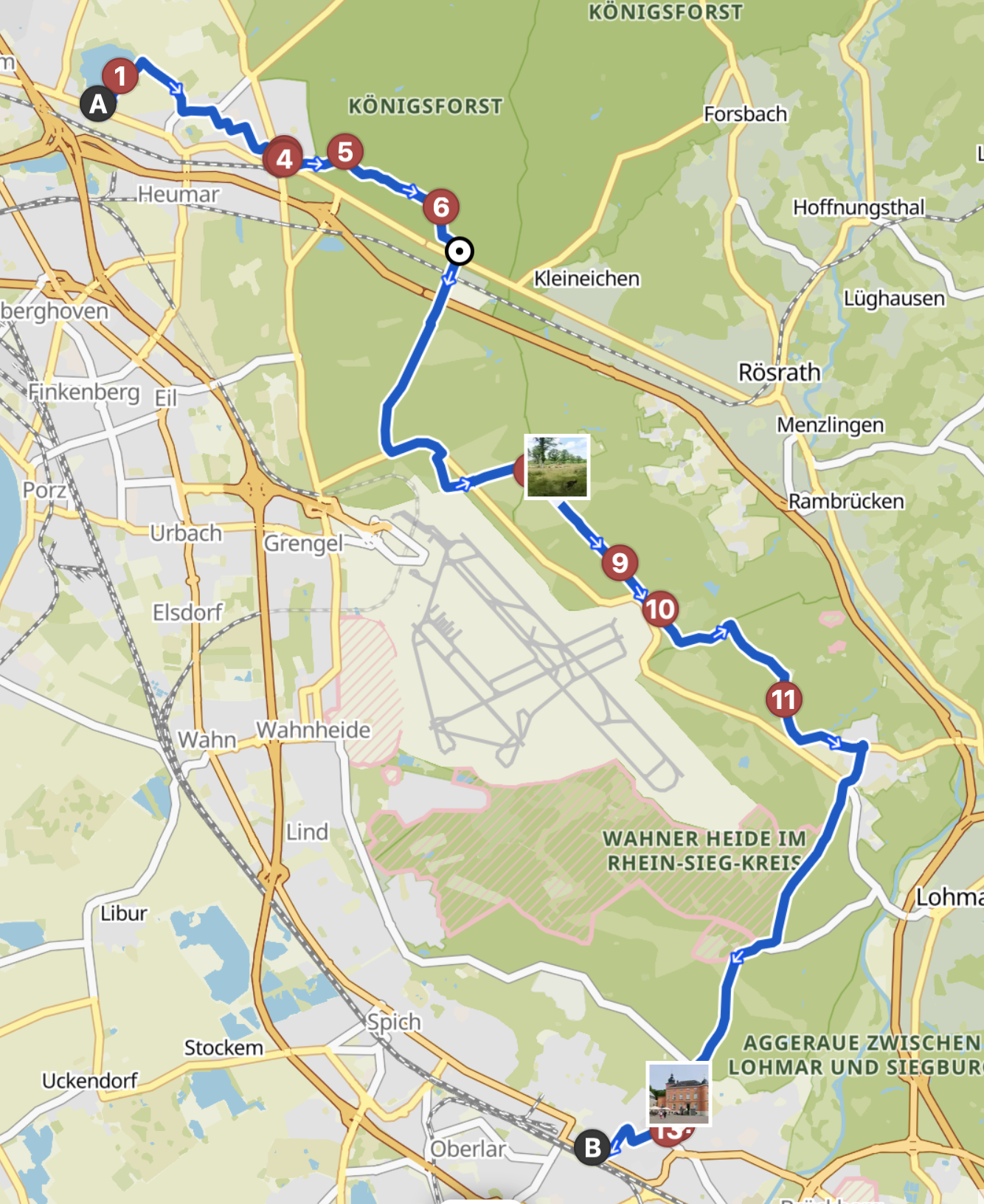 Nachdem ich sie etwas angepasst und vor allem meine damaligen Komoot-Fehler ausgemerzt habe, und nachdem ich meinen gesamten Kram beisammen habe, ist es schon fast Mittag. (Also fast den gesamten Kram, natürlich habe ich die Wasserflasche vergessen.) Nach einer kleinen Stärkung an der Schmitzebud geht es erst richtig los.