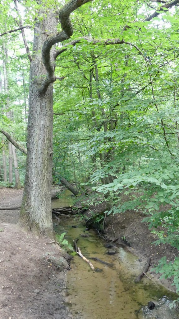 Ich fahre durch den Wildniswald im Königsforst (Komoot meckert, der Plan war anders!) Hier ist es dunkel, kühl und schattig. Die aktuelle Tiefe der Furt durch den Giesbach kann ich nicht so gut abschätzen. Also schiebe ich barfuß durch. Erfrischend! Und ziemlich flach. Ich sollte öfter mal barfuß durch den Wald laufen.
