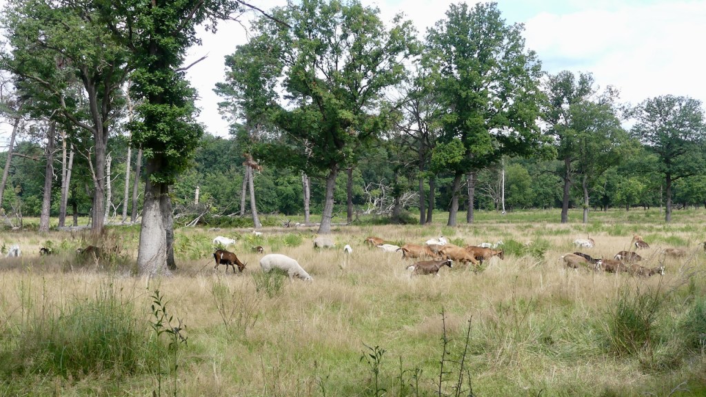 Gegenüber dehnt sich eine Savanne aus, mit Ziegen und Schafen