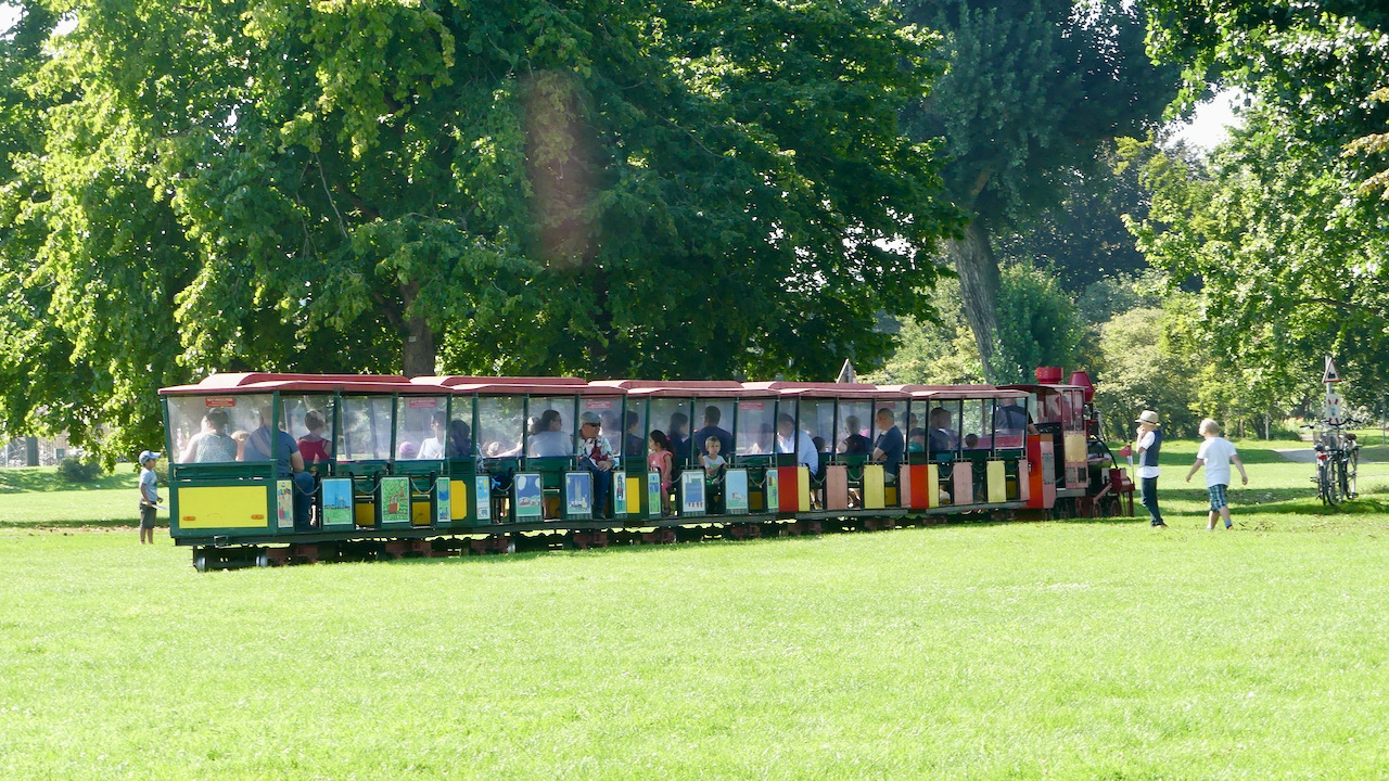 Im Rheinpark , der 1957 im Rahmen der ersten Bundesgartenschau entstandenen Parkanlage, fährt noch immer die Bimmelbahn, am Rheinufer wird eine Messe gefeiert.