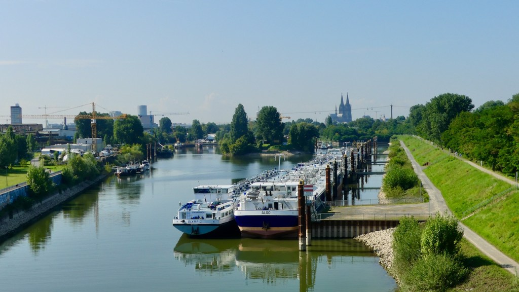 Nach nur 30 Minuten stehe ich am Rheinufer. Wohin jetzt? Da ich weiß, dass die Drehbrücke zu den Poller Wiesen gesperrt und die Umleitung wenig erbaulich ist, wende ich mich nach rechts, dem Rhein zu folgen.