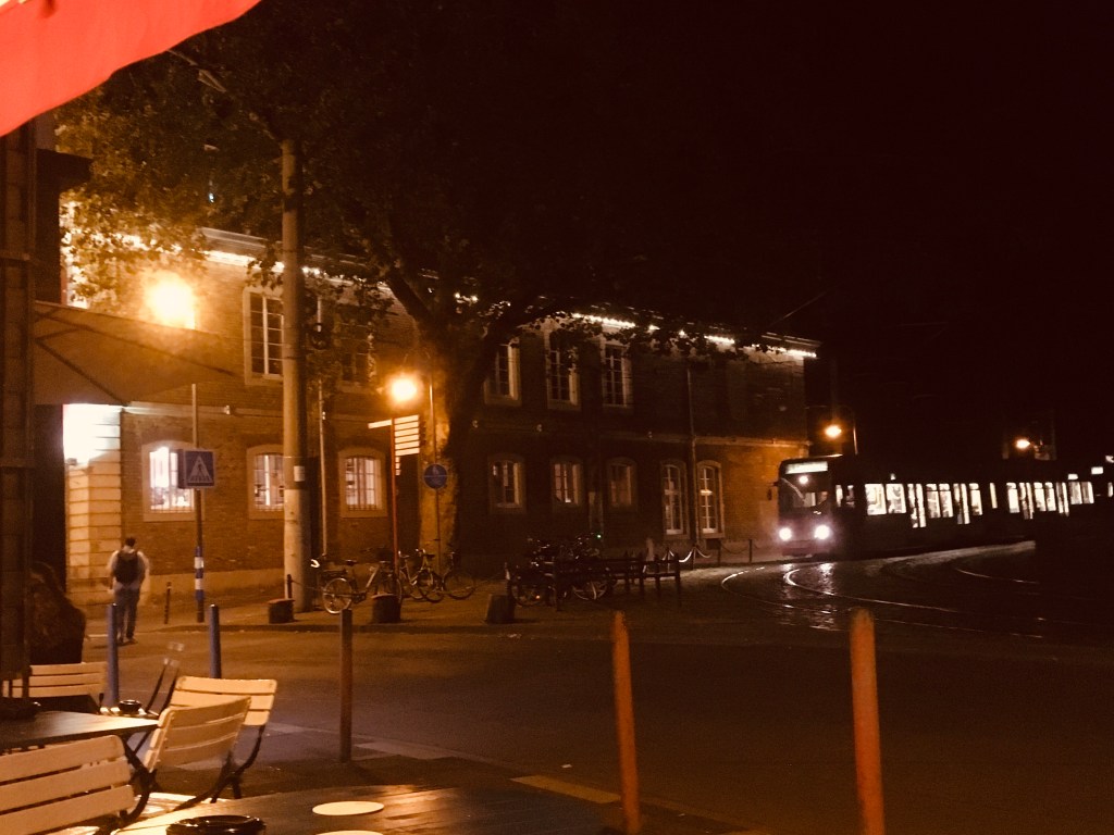 Nach dem Aikido sitze ich an der Haltestelle und warte, als die Bahn in die Gegenrichtung anhält und stehen bleibt, Warnblinker an.
