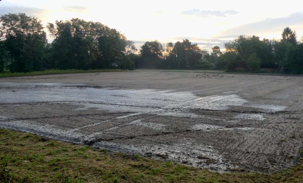Am Morgen nach dem Unwetter ist das Feld noch immer mit einer Schlammschicht überzogen.