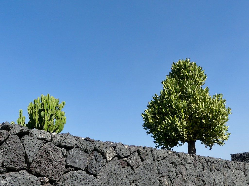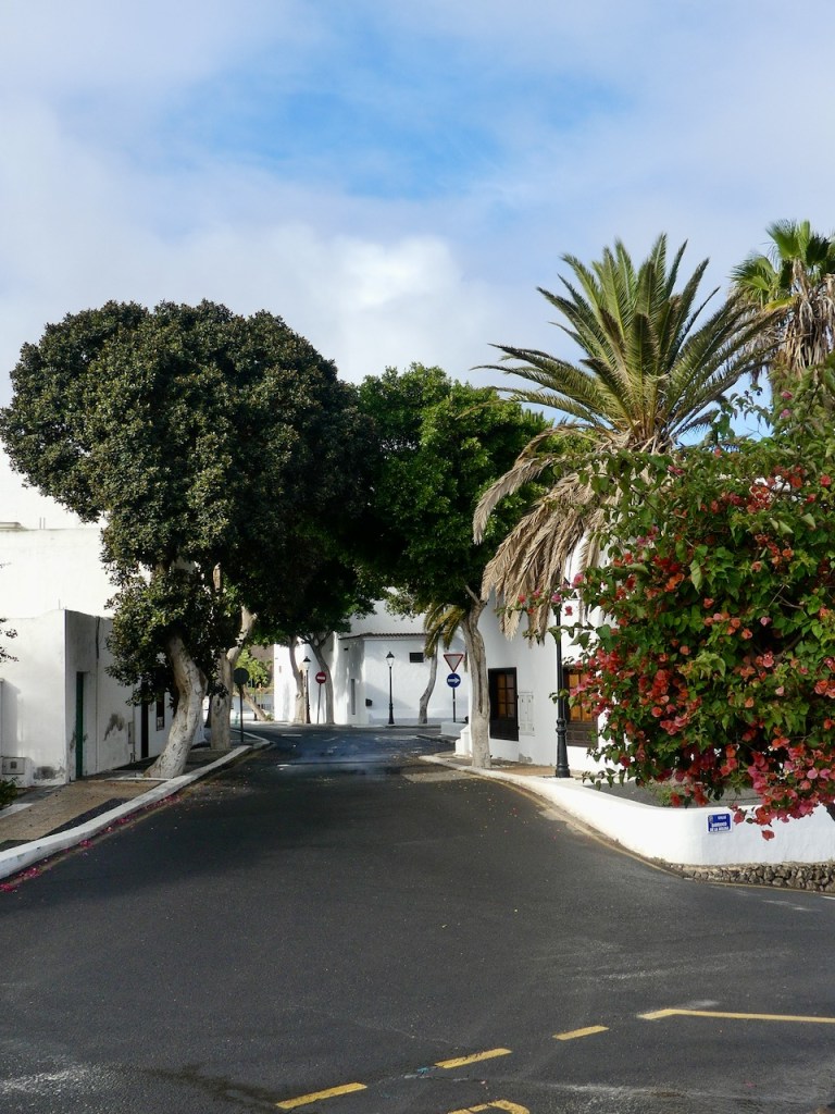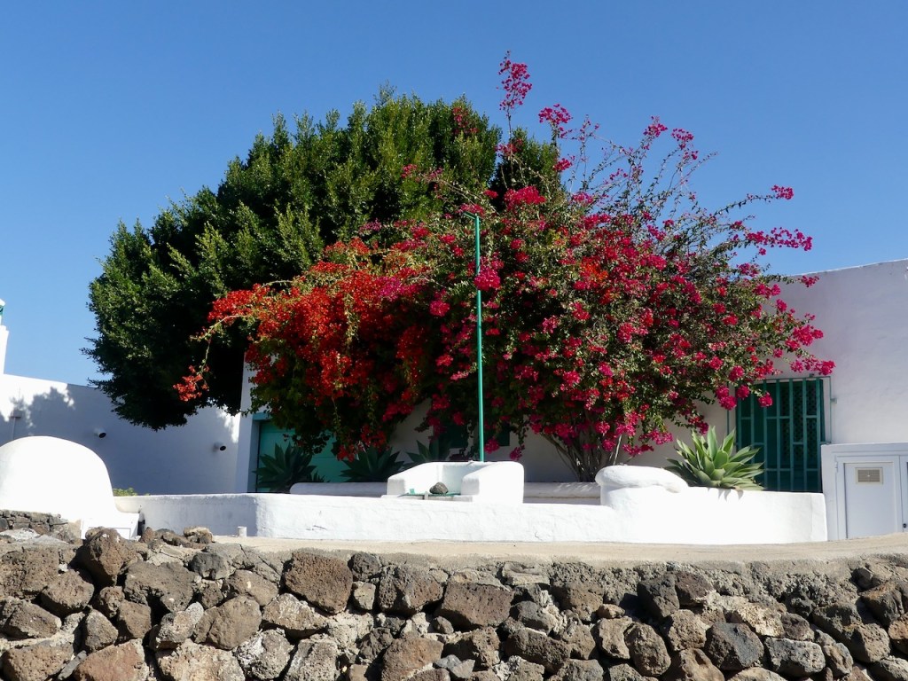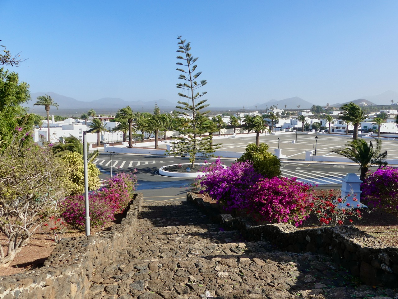 Auf dem täglichen Weg zur Weg zur Bushaltestelle Supermercado de Yaiza bieten sich auch schöne Ein und Ausblicke. Während bei uns die Gärten zugeschottert werden, wachsen hier in der wüstenhaften Umgebung, Bäume, Palmen, Kakteen und blühende Burgainvilleen an jeder verfügbaren Ecke.