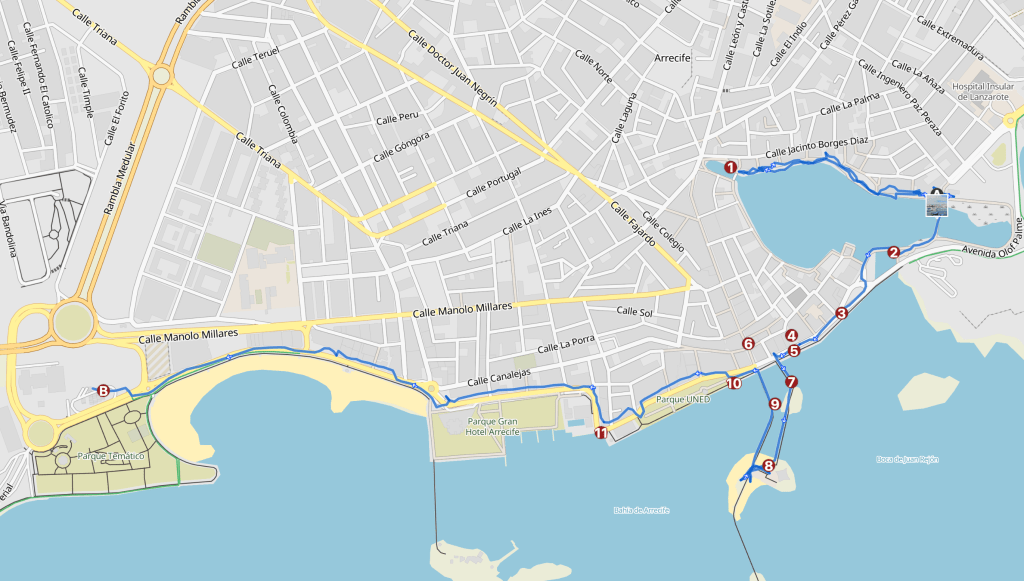 Der Anfang, vom Busbahnhof zum Charco fehlt, weil Komoot mal wieder ausgestiegen ist.