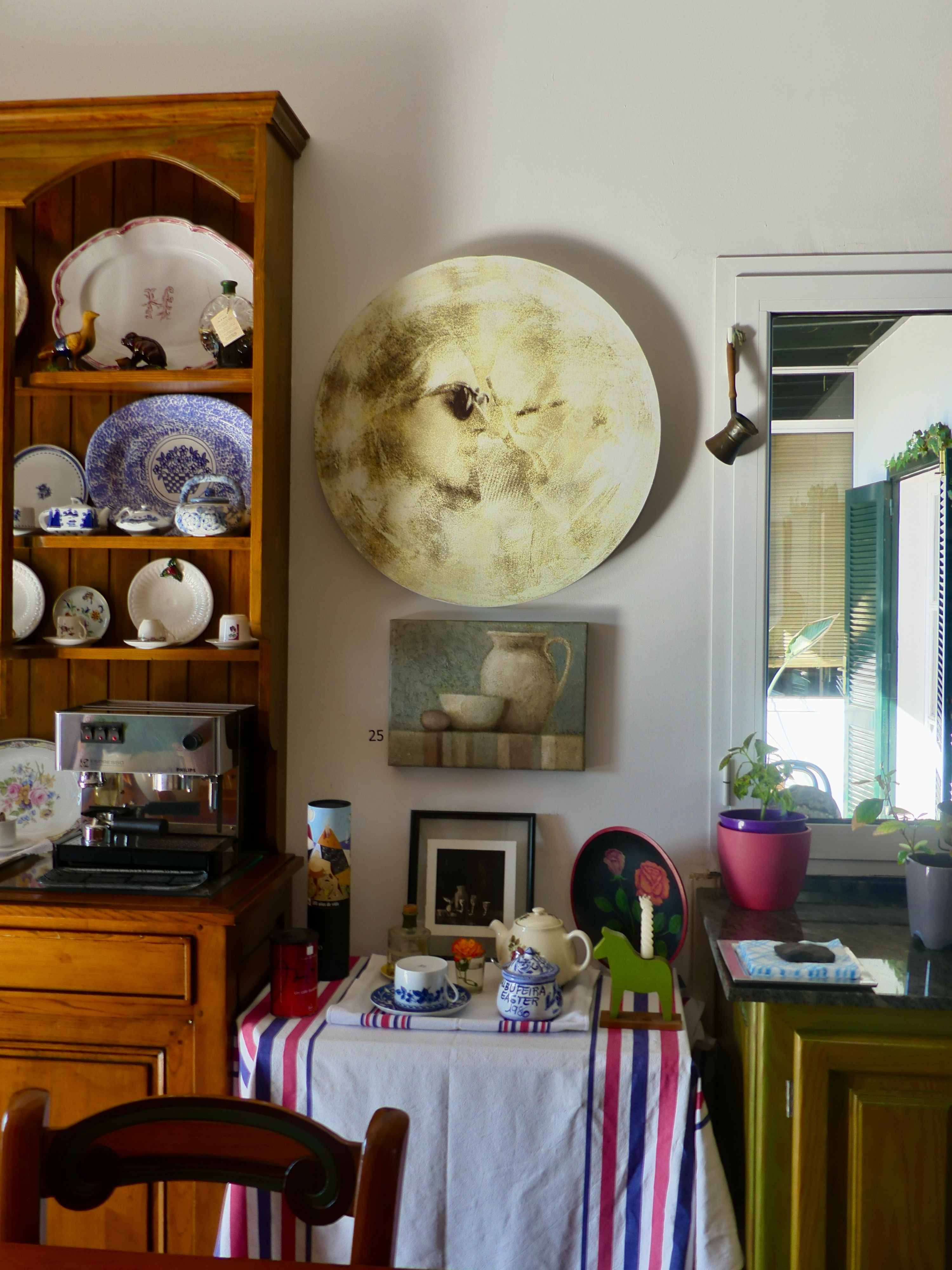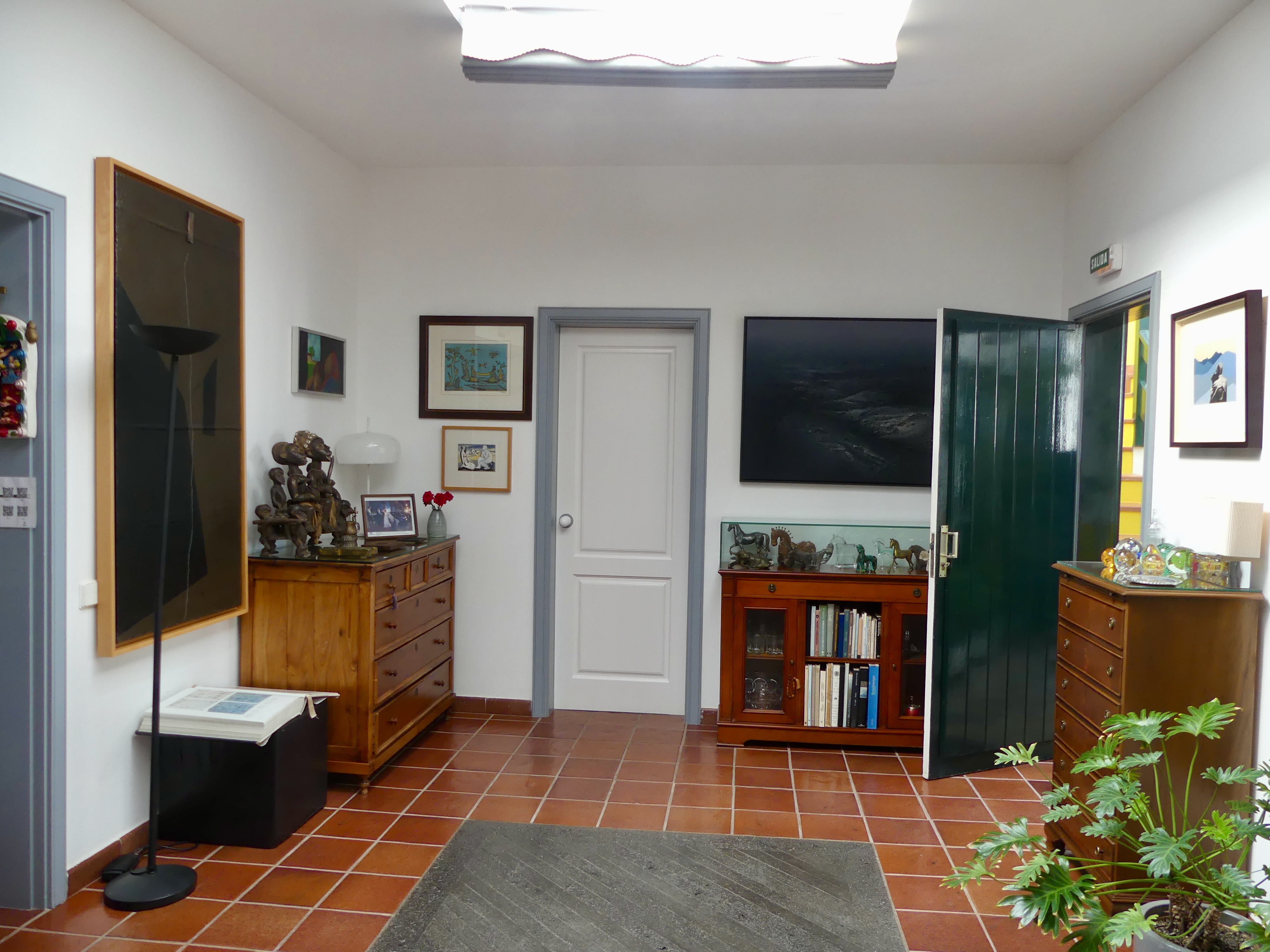 Zuerst besichtigen wir das Wohnhaus, in einem Teil davon lebt noch seine Familie. Das Wohnzimmer Sterbezimmer, den Garten, und die Küche in der eine freundliche Katze lebt. In allen Räumen hängen Bilder befreundeter Künstler.
