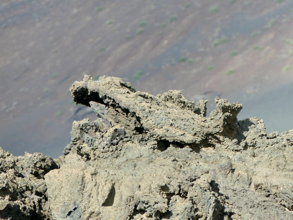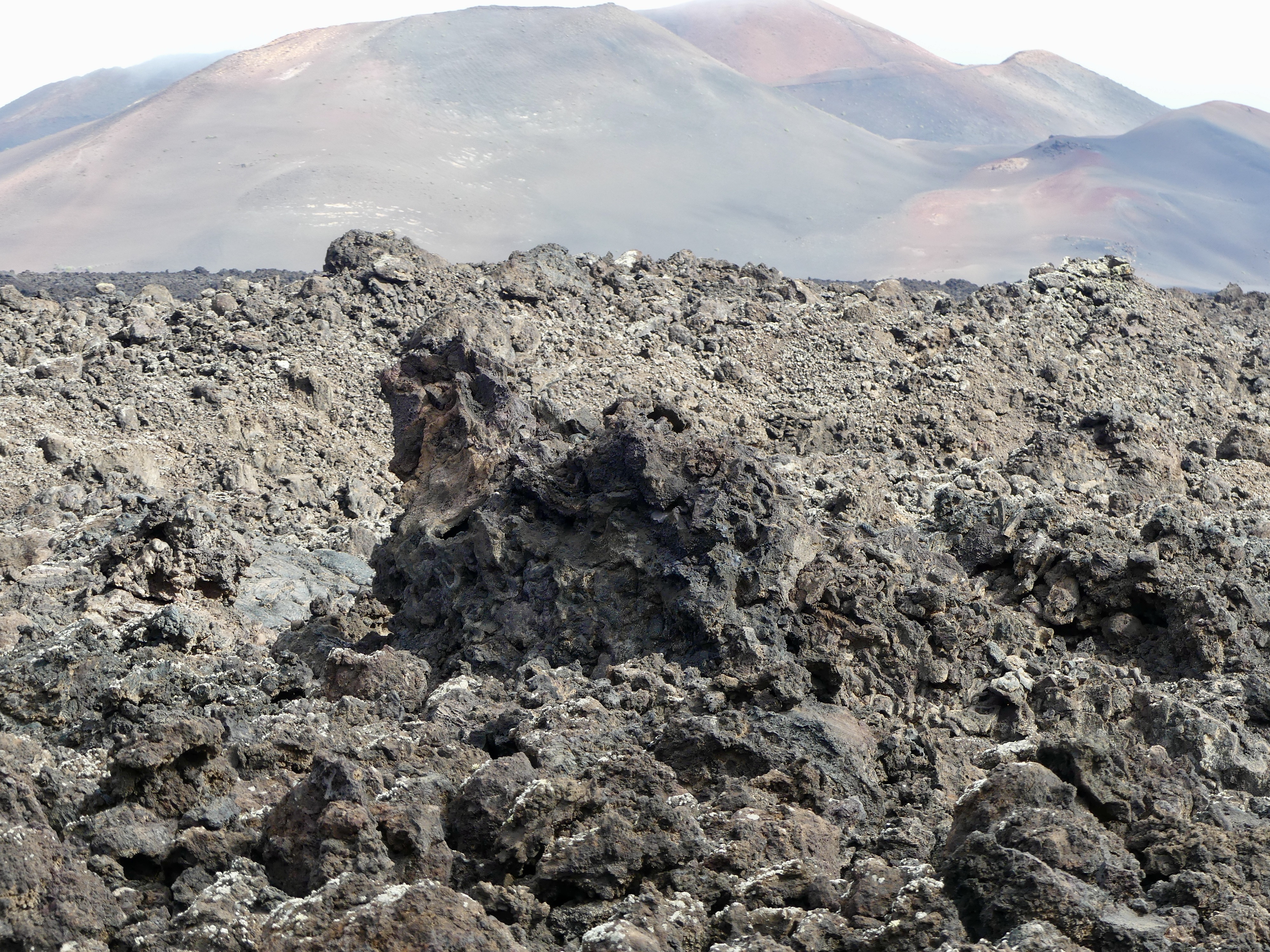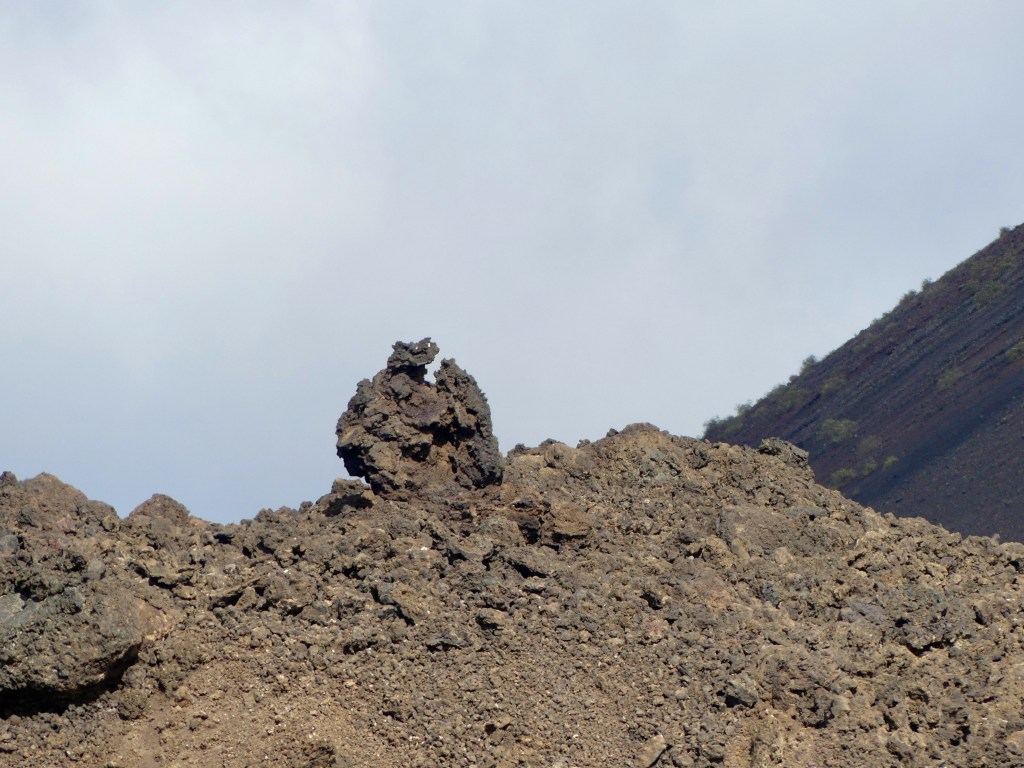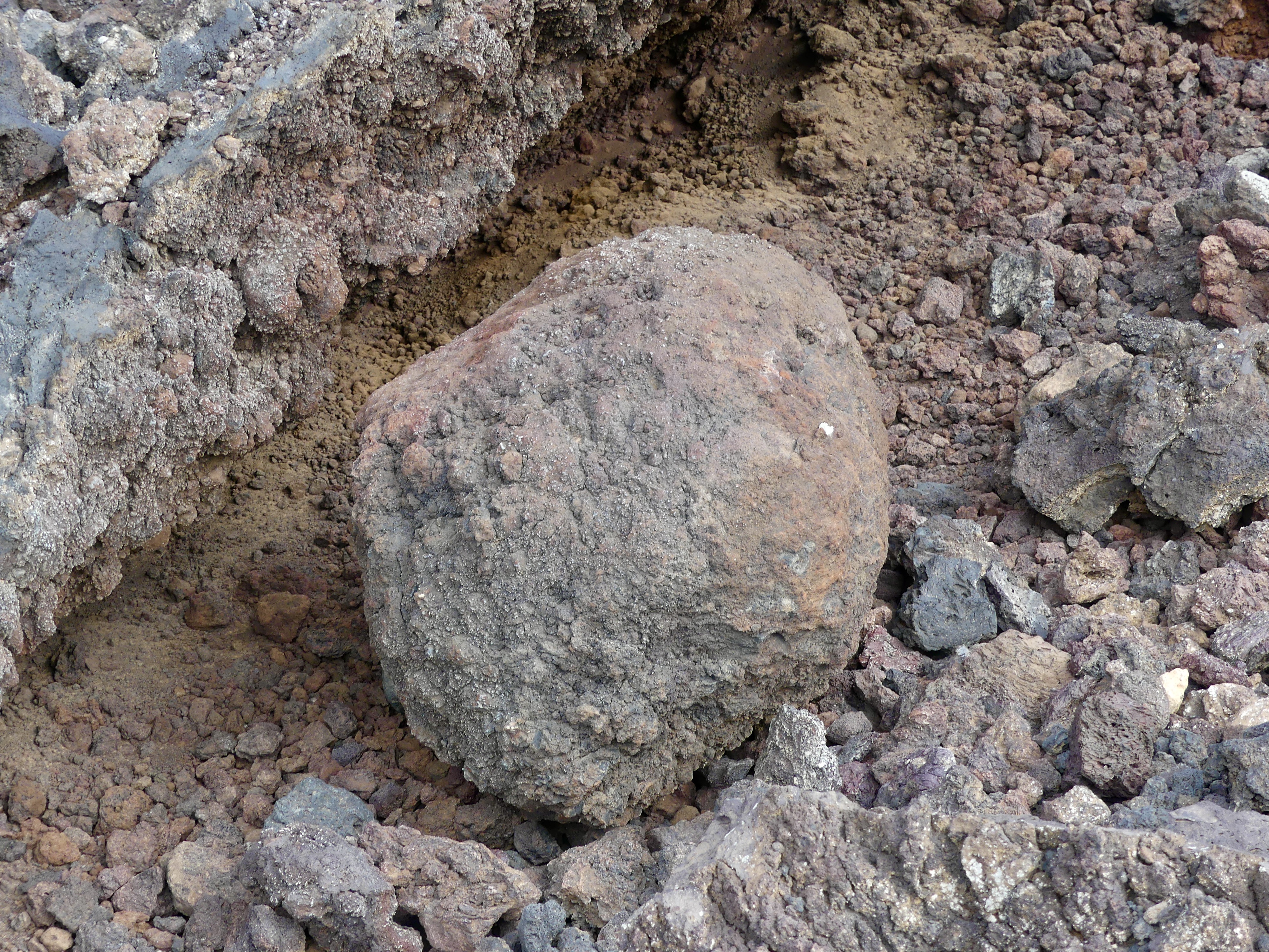 Pahoehoe gibt es hier weniger. Da kann man mit nackten Füßen drauf treten. Die Bomben werden aus dem Schlot geschleudert. Manchmal, wenn man sie öffnen kann, enthalten sie Olivin-Kristalle.