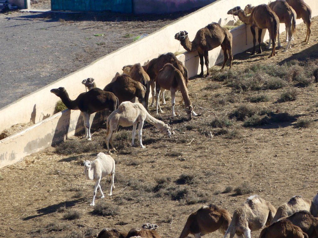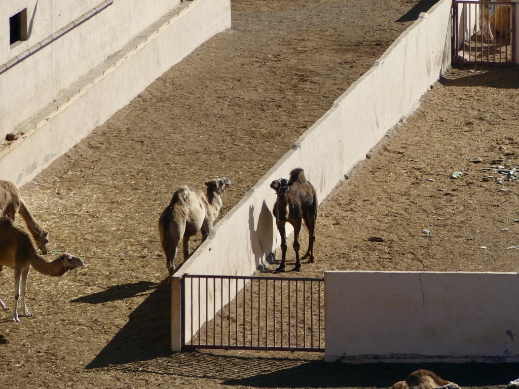 Von unten sehe ich nicht viel, weil die Ummauerung ungefähr kamelhoch ist. Ich erhasche einen Blick auf ein absolut niedliches weißes Kamelchen, noch mit herabhängender Nabelschnur, aber schon ist es um eine Ecke gebogen.