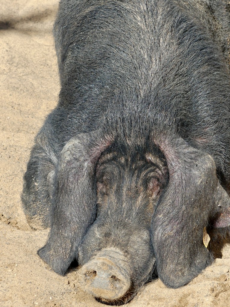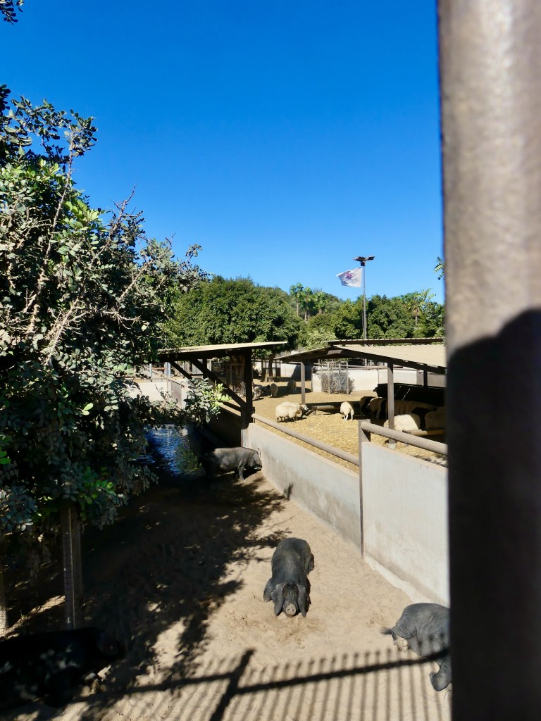 Beschattet von hohen Bäumen leben Schweine, Ziegen, Schafe und Kühe und nebenan reifen Obst und Gemüse.