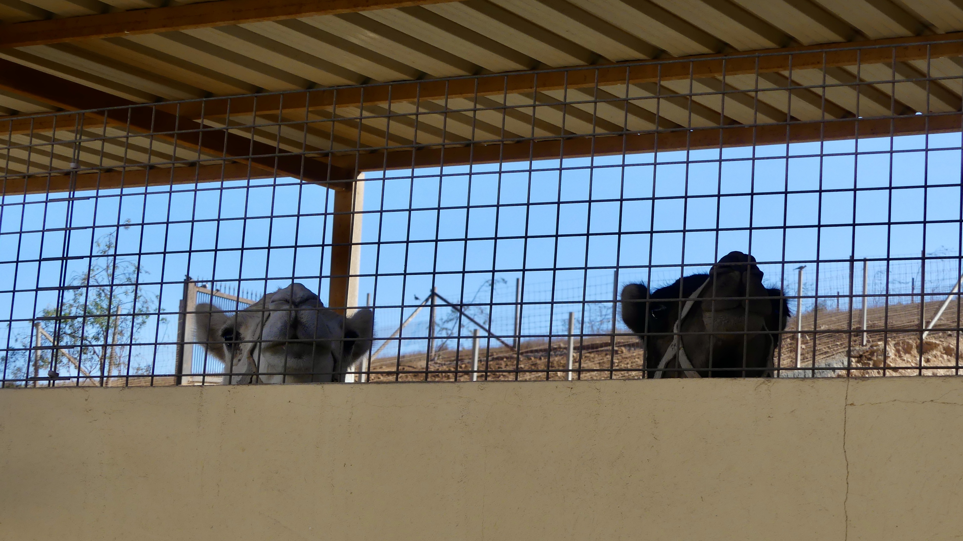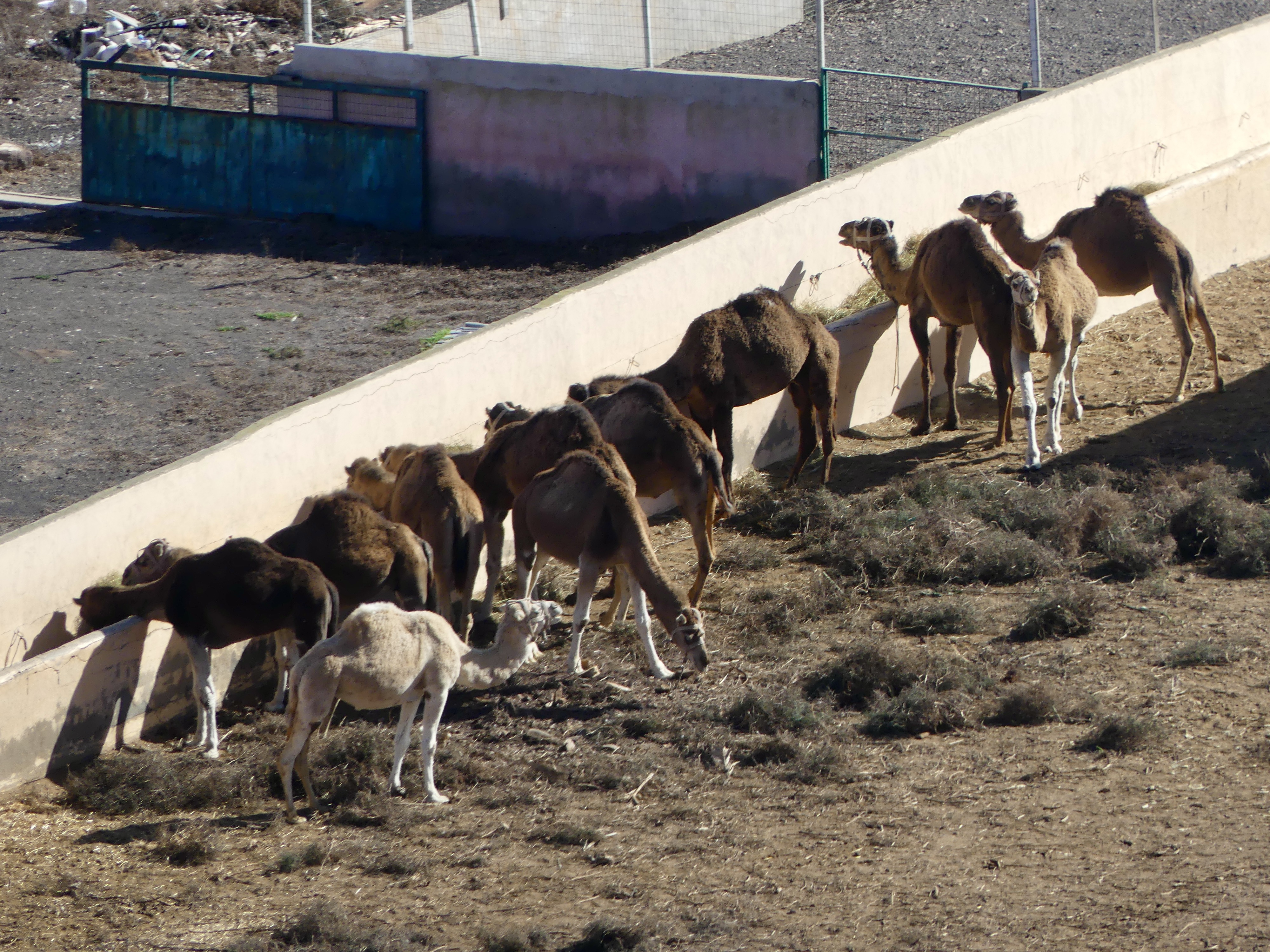 Von unten sehe ich nicht viel, weil die Ummauerung ungefähr kamelhoch ist. Ich erhasche einen Blick auf ein absolut niedliches weißes Kamelchen, noch mit herabhängender Nabelschnur, aber schon ist es um eine Ecke gebogen.