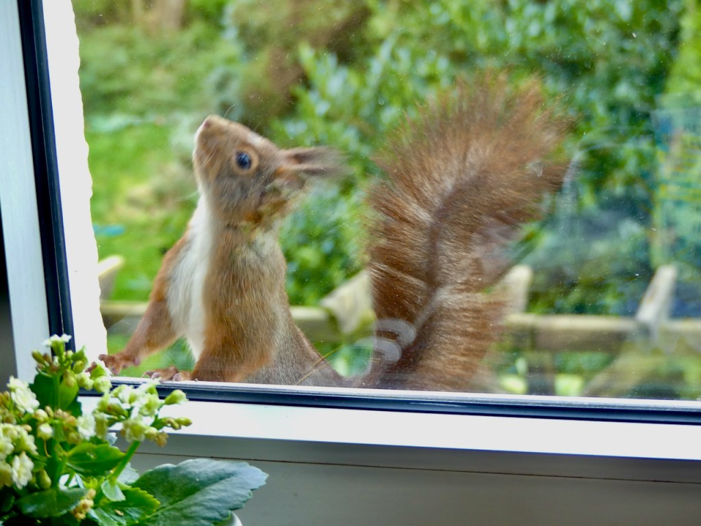 Seit einiger Zeit besucht mich das neugierige Eichhörnchen, vom Garten aus gesehen im ersten Stock. Bisher war es aber unfotografierbar. Immer schnell abgetaucht, wenn ich die Kamera hoch nahm. Klar bekommt es ein paar Nüsse. Ich bin ja der Meinung, es weiß genau, wer ich bin und beschwert sich, dass es nicht mehr das Vogelfutter plündern kann.