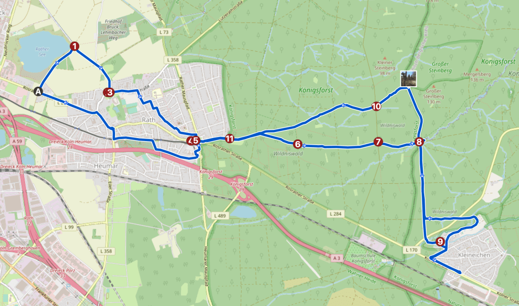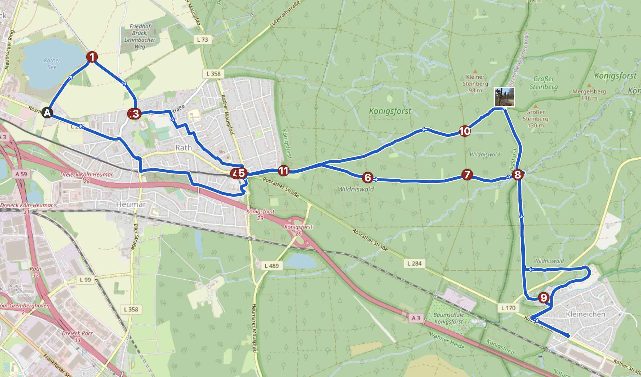 Über den Steinbruchsweg ging es sehr schnell bergab Richtung Rath. Dort angekommen habe ich noch mal eben etwas eingekauft. Die beste Anschaffung, spontan mit dem Fahrrad, war übrigens eine kleine Tasche für den Gepäckträger. vorher bin ich auf kurzen Touren immer entweder mit einer großen Packtasche rumgefahren oder mit der Kameratasche am Lenker, oder ganz ohne. Die kleine Tasche hat Platz genug genug für einen kleinen Einkauf oder eine Regenjacke und ein Buch oder Kleinkram und bremst nicht so stark bei Gegenwind.
