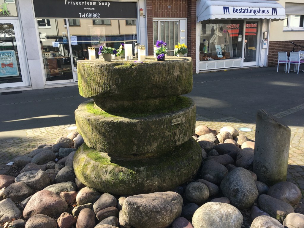 Der Brunnen in Dellbrück ist mit Blumen und Friedhofskerzen geschmückt.