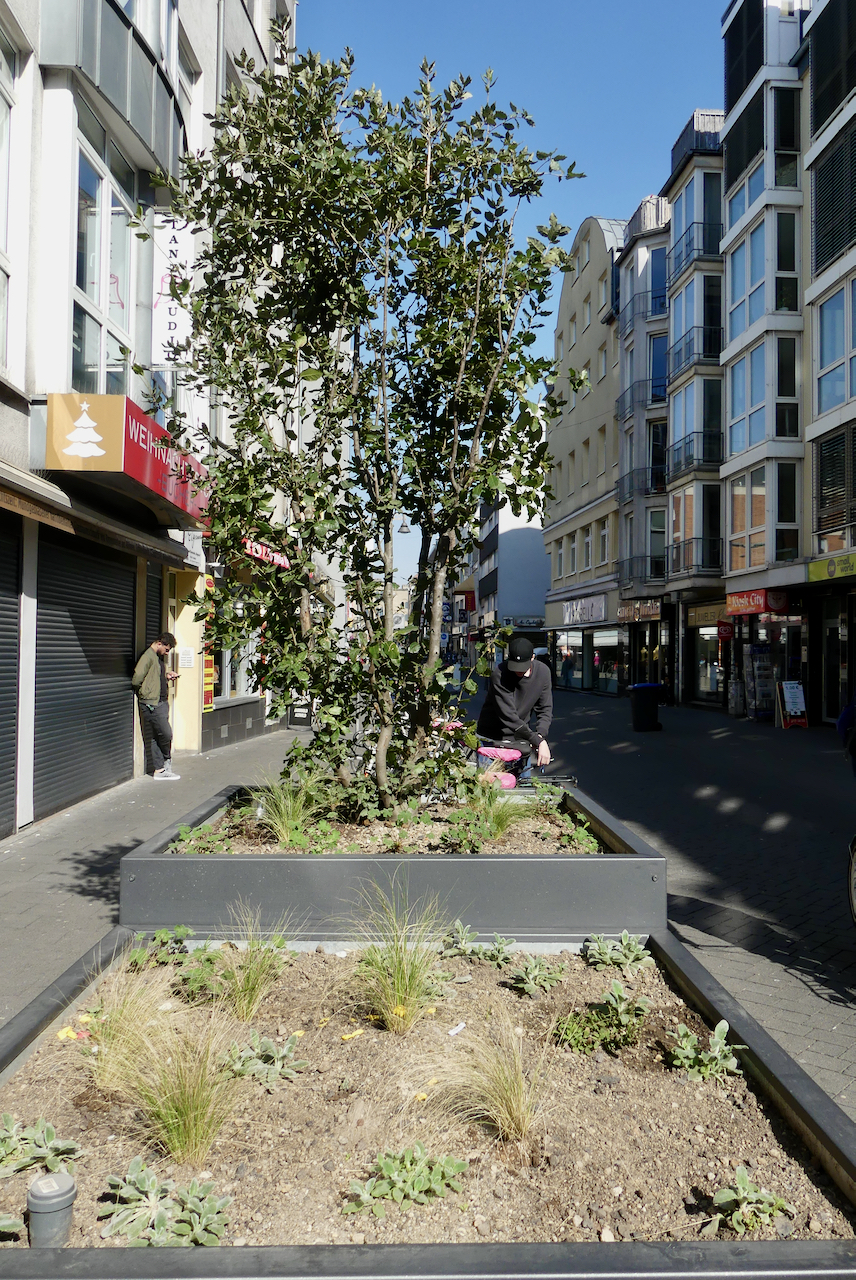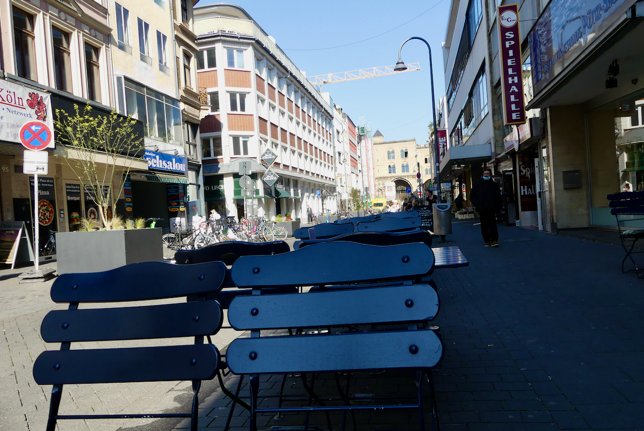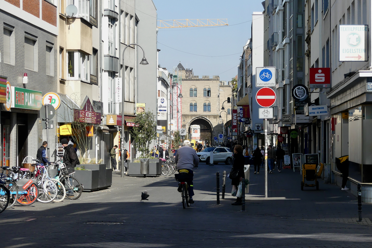 Vorher würdige ich den autofreien Eigelstein. Wo sich früher die Blechlawine durchquälte, haben Anwohner und Stadt die Notbremse gezogen. Jetzt ist die schmale Fahrbahn Fahrradstraße, und wo vorher überdimensionierte Autos parkten stehen Fahrradständer, Kübel statt Karren, und Außengastronomie.