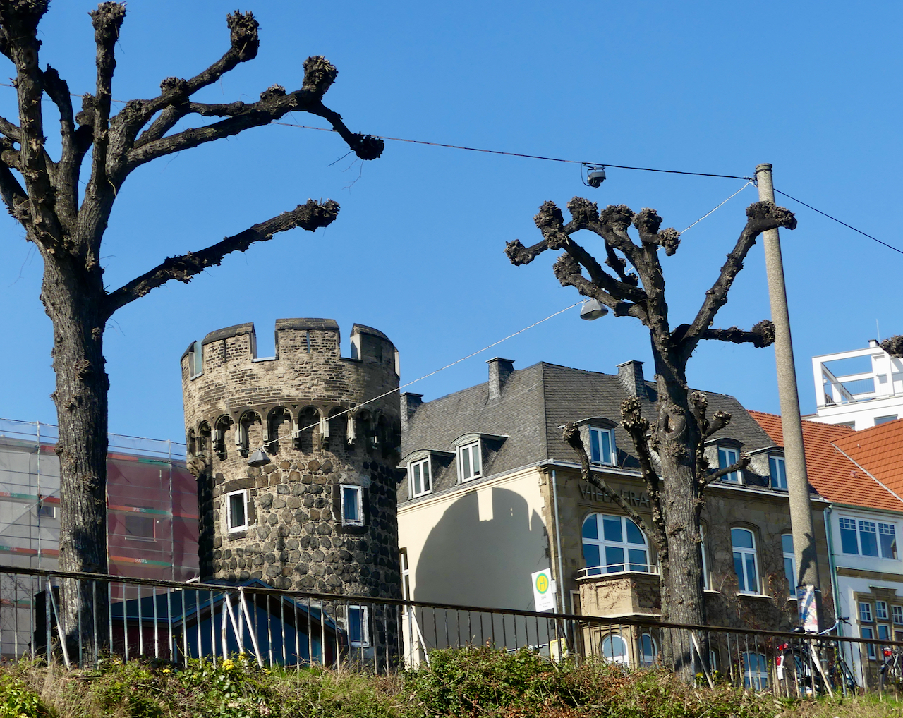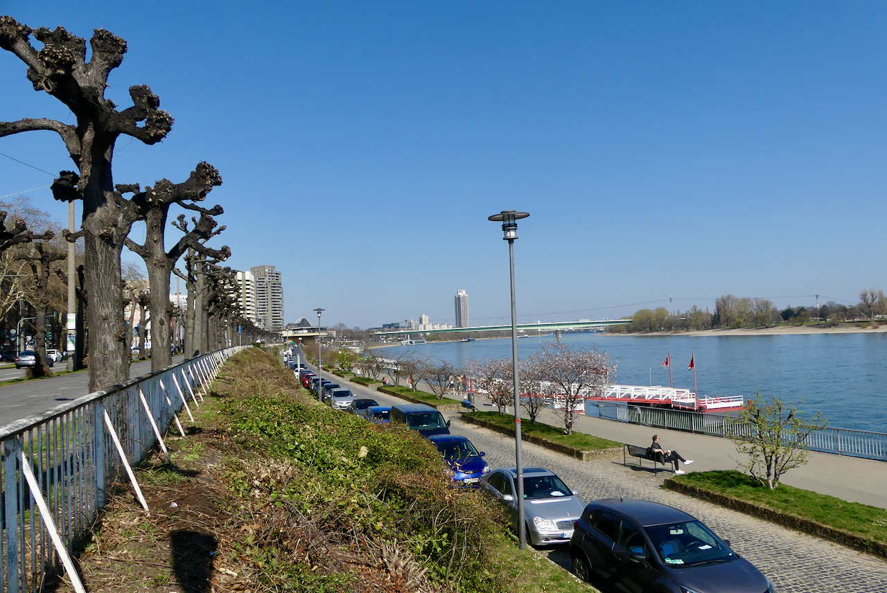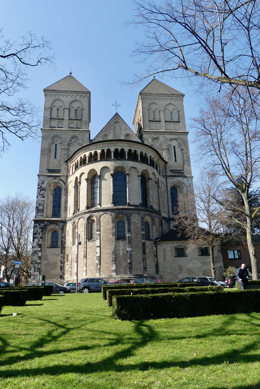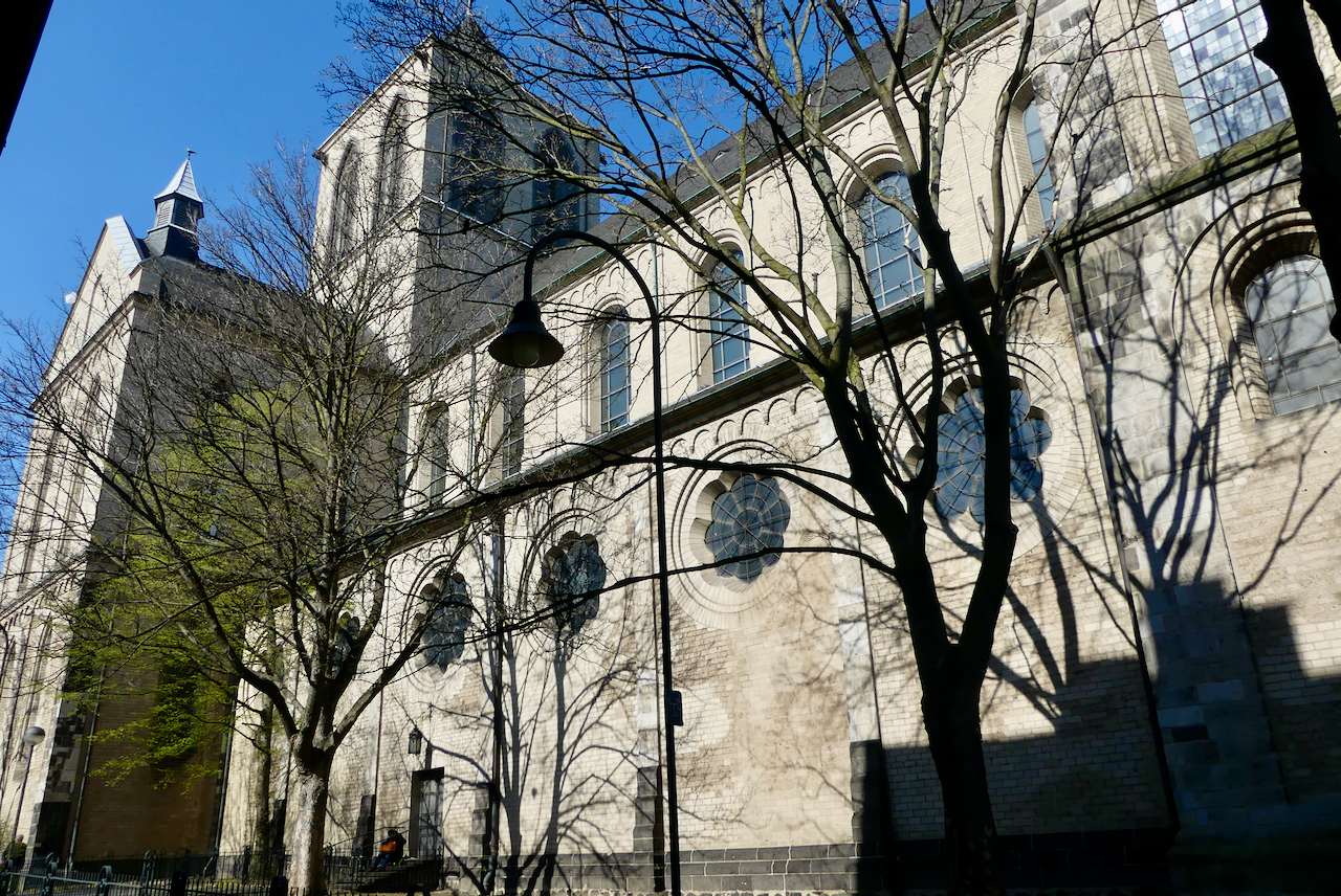 Ich verlasse Unter Krahnenbäumen und trete wieder ins Licht. Sankt Kunibert ist eine der 12 großen romanischen Kirchen in Köln. Eine Besichtigung des Bauwerks lohnt sich, aber dieses Mal gehe ich über eine schmale Stiege hinunter an den Rhein.