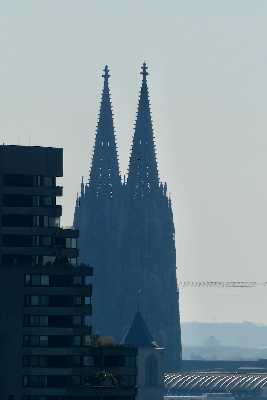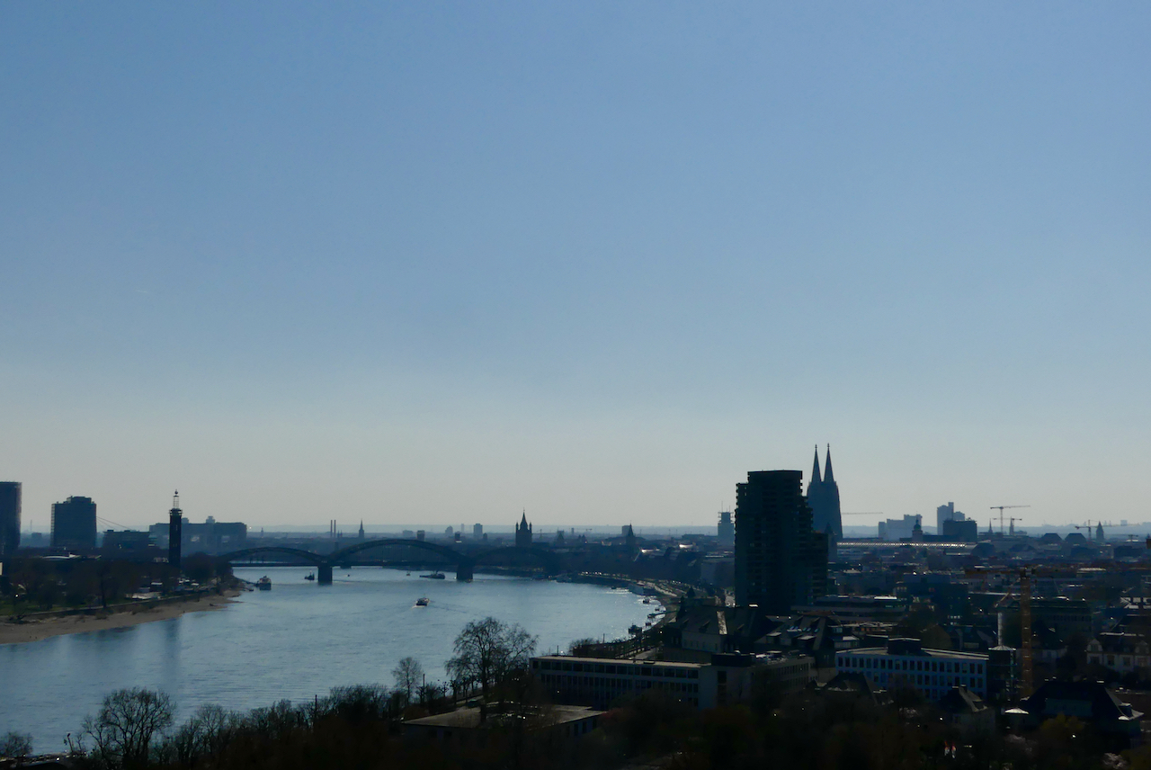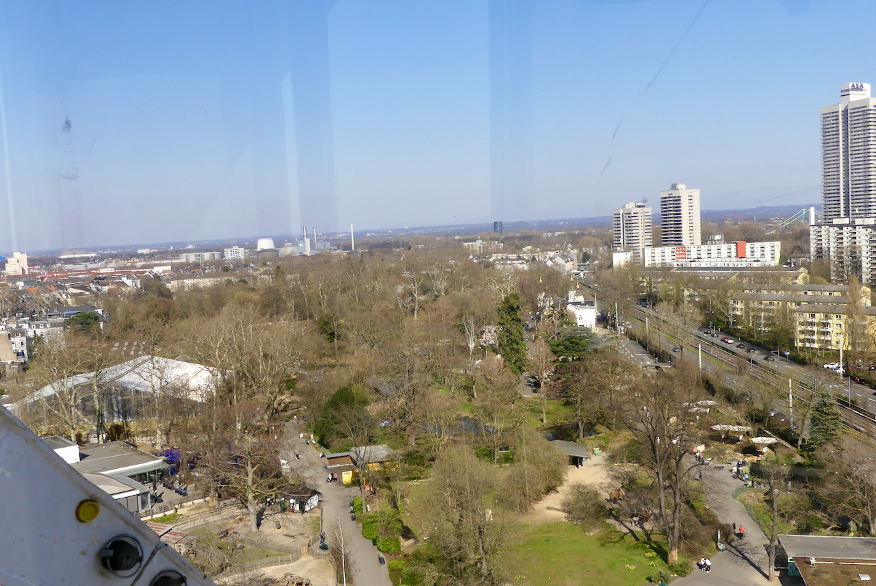 Von dort oben hat man einen guten Ausblick auf Zoo, Flora und die Innenstadt. Leider liegt der Dom im Dunst, aber in die andere Richtung, über den Rhein kann man bis Bergisch-Gladbach sehen.