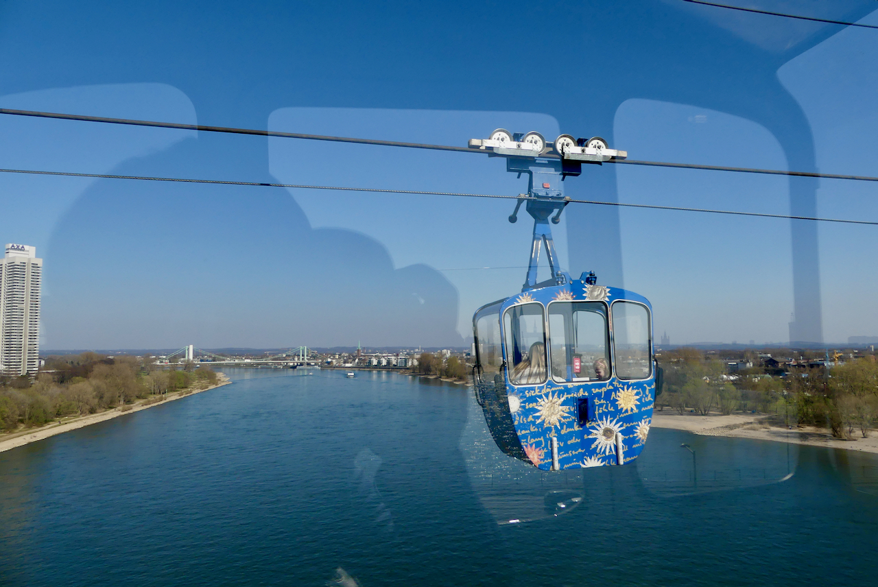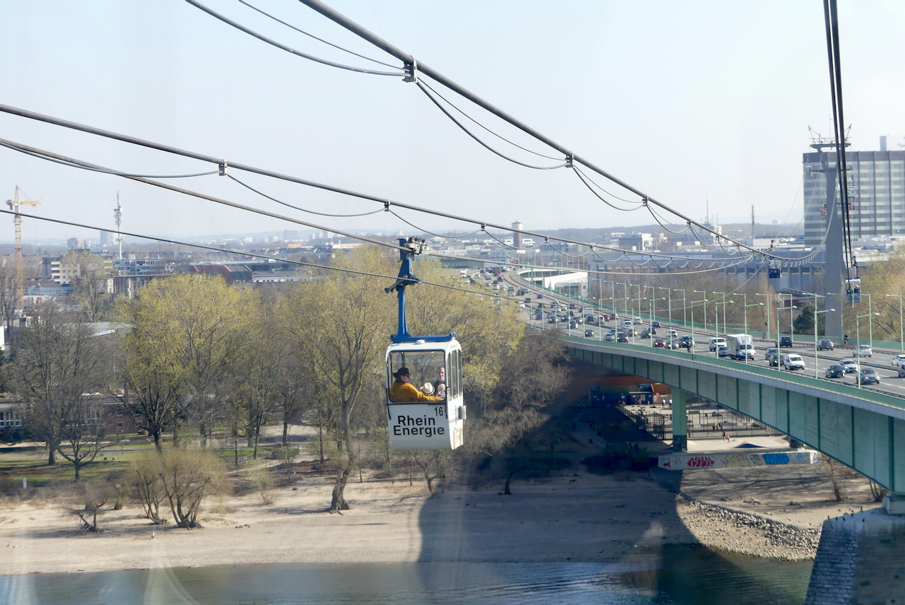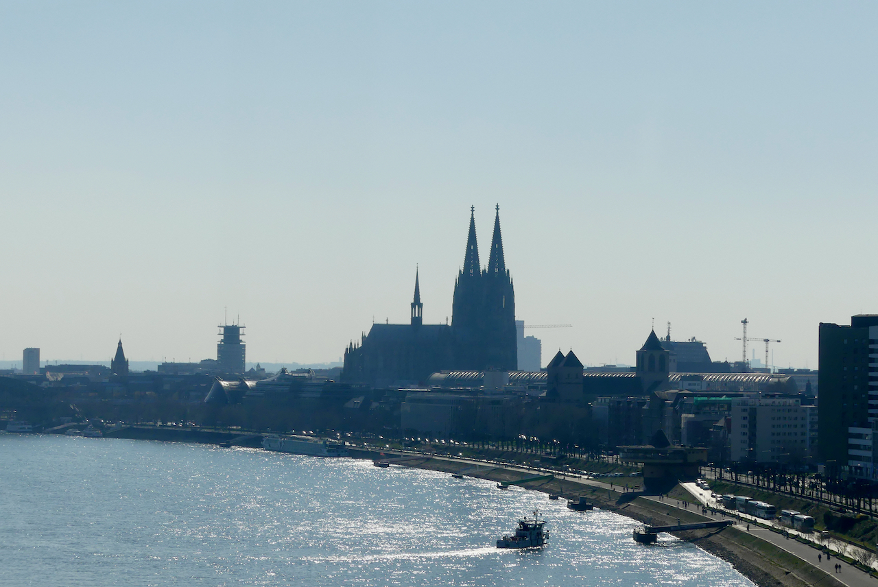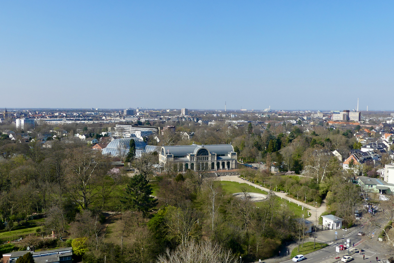 Von dort oben hat man einen guten Ausblick auf Zoo, Flora und die Innenstadt. Leider liegt der Dom im Dunst, aber in die andere Richtung, über den Rhein kann man bis Bergisch-Gladbach sehen.