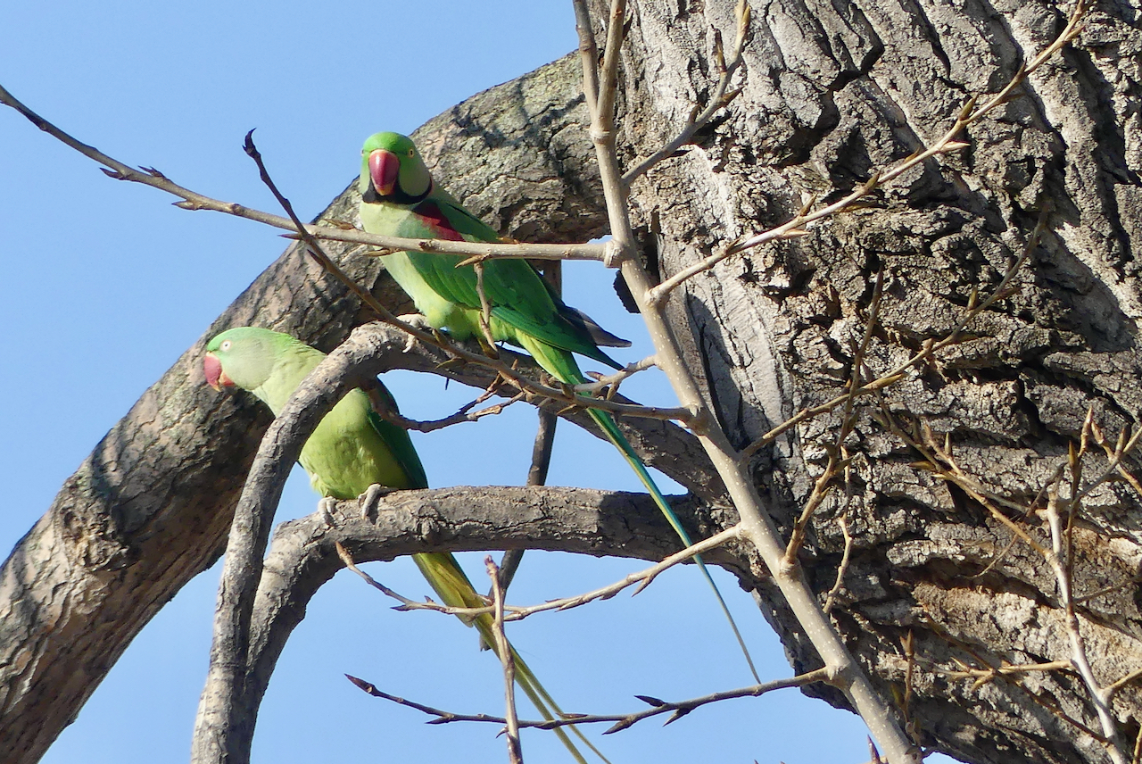 Auf die Entfernung kann man Alexandersittiche leicht mit Halsbandsittichen (kleiner Alexandersittich) verwechseln. Aber sie sind größer und das Männchen hat rote Flecken an den Flügeln und im Nacken. Mit dem kräftigen Schnabel möchte ich lieber nicht in Berührung kommen. Die Höhlenbrüter leben hier in den alten Weiden.