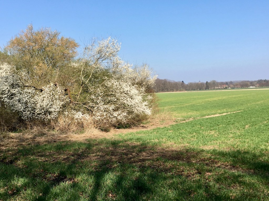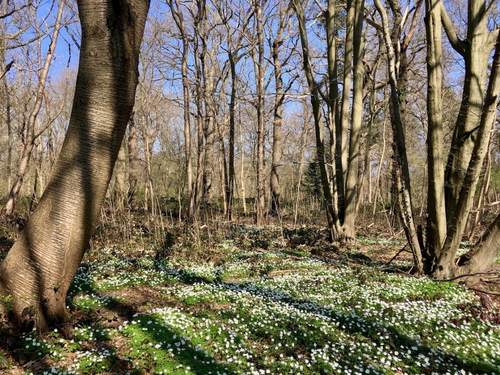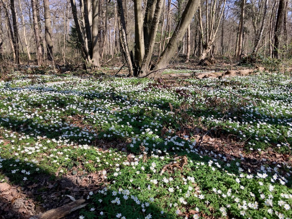 Aber dann sollte ich kurz vor dem Gut Mielenforst links abbiegen. Oha! Also nicht über den Mauspfad. Hier bin ich bei meiner Rückenwind-Tour schon mal entlang gefahren. Und jetzt lande ich in einem Meer aus Buschwindröschen.