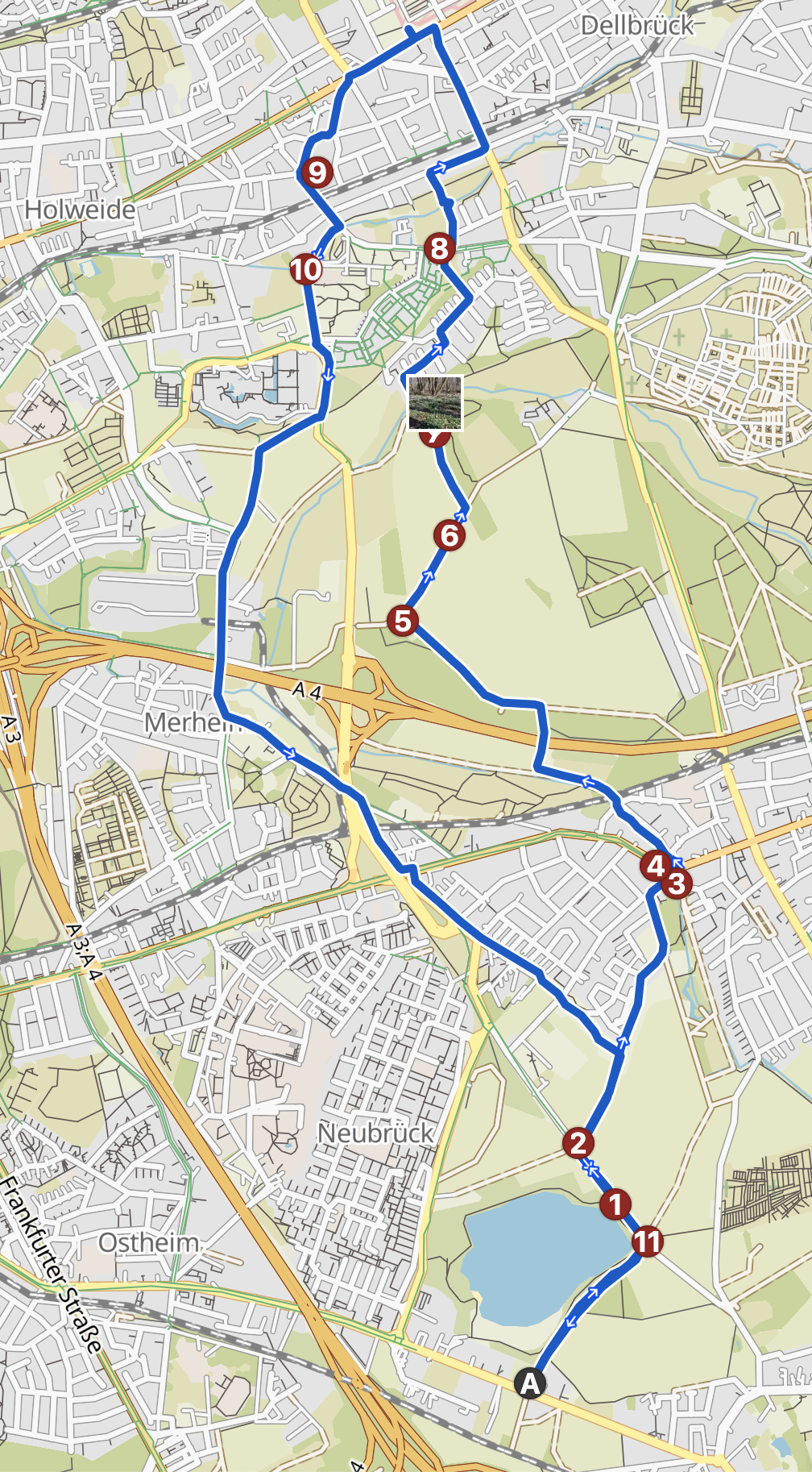 Der Rückweg führt mich auf weitgehend bekannten Straßen und Wegen, zuerst durch die denkmalgeschützte Märchensiedlung, am Krankenhaus Holweide und am AXA-Gelände vorbei, das Stückchen Ostmerheimer Straße mag ich nicht, ist aber unvermeidbar. Und ganz am Schluss bringe ich Komoot doch noch zum motzen, weil ich durch die Felder zurück fahre und nicht über Neubrück.