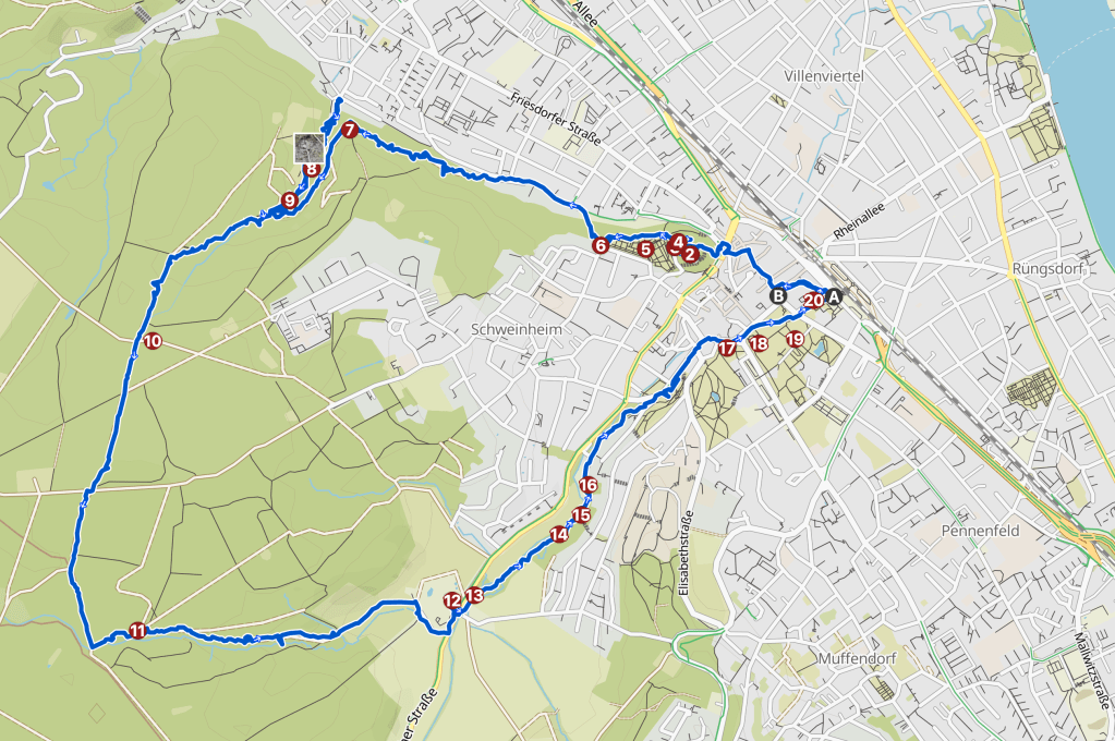 Karfreitag ist ein Feiertag, an dem Feiern verboten ist. Ich stehe bibbernd am Bahnhof. Es ist noch kalt in Köln. Die Tour „Geologischer Lehr und Wanderpfad Godesberg“ habe ich von Waymarked Trails irgendwann mal geladen und nur den Einstieg geändert.