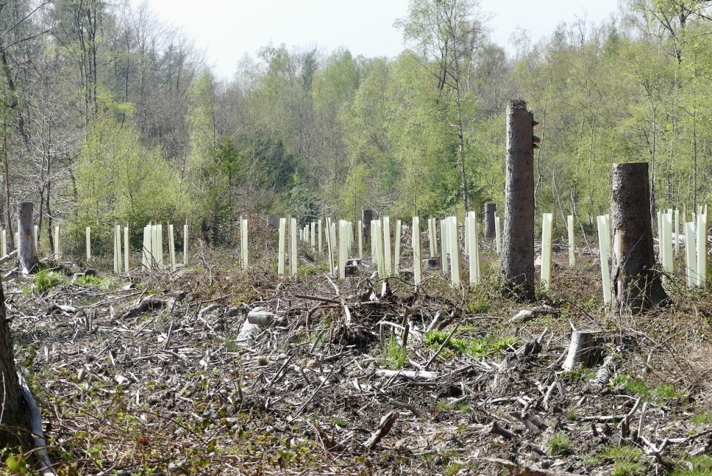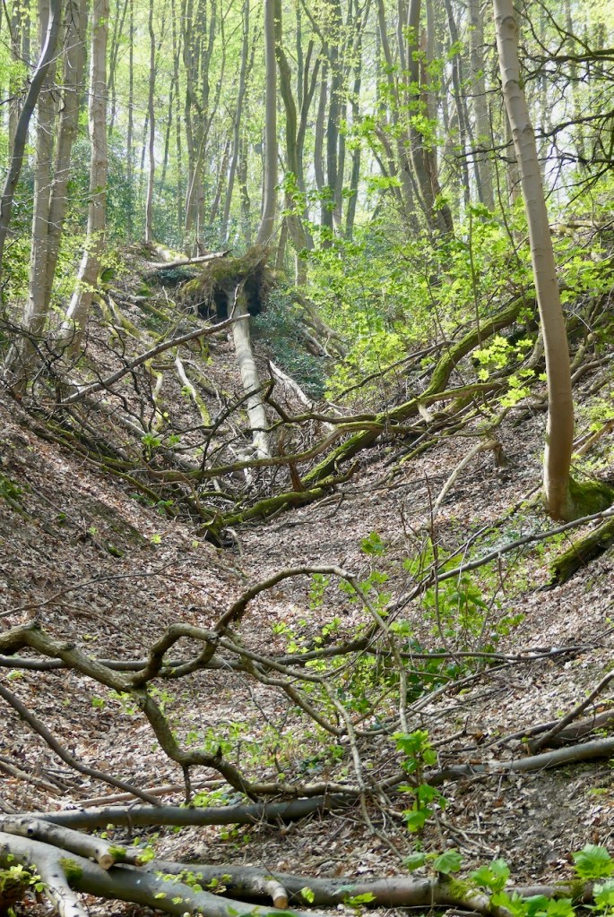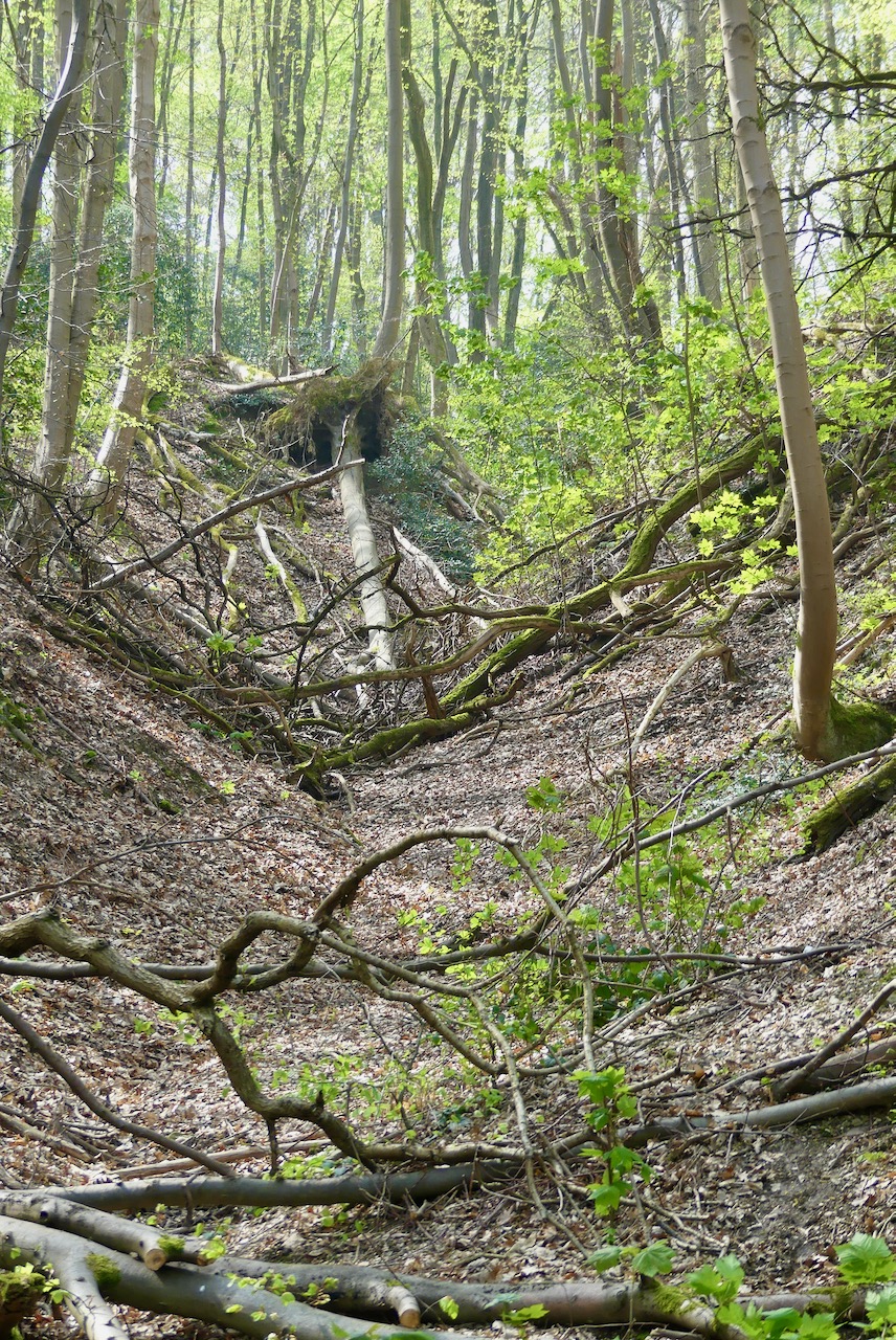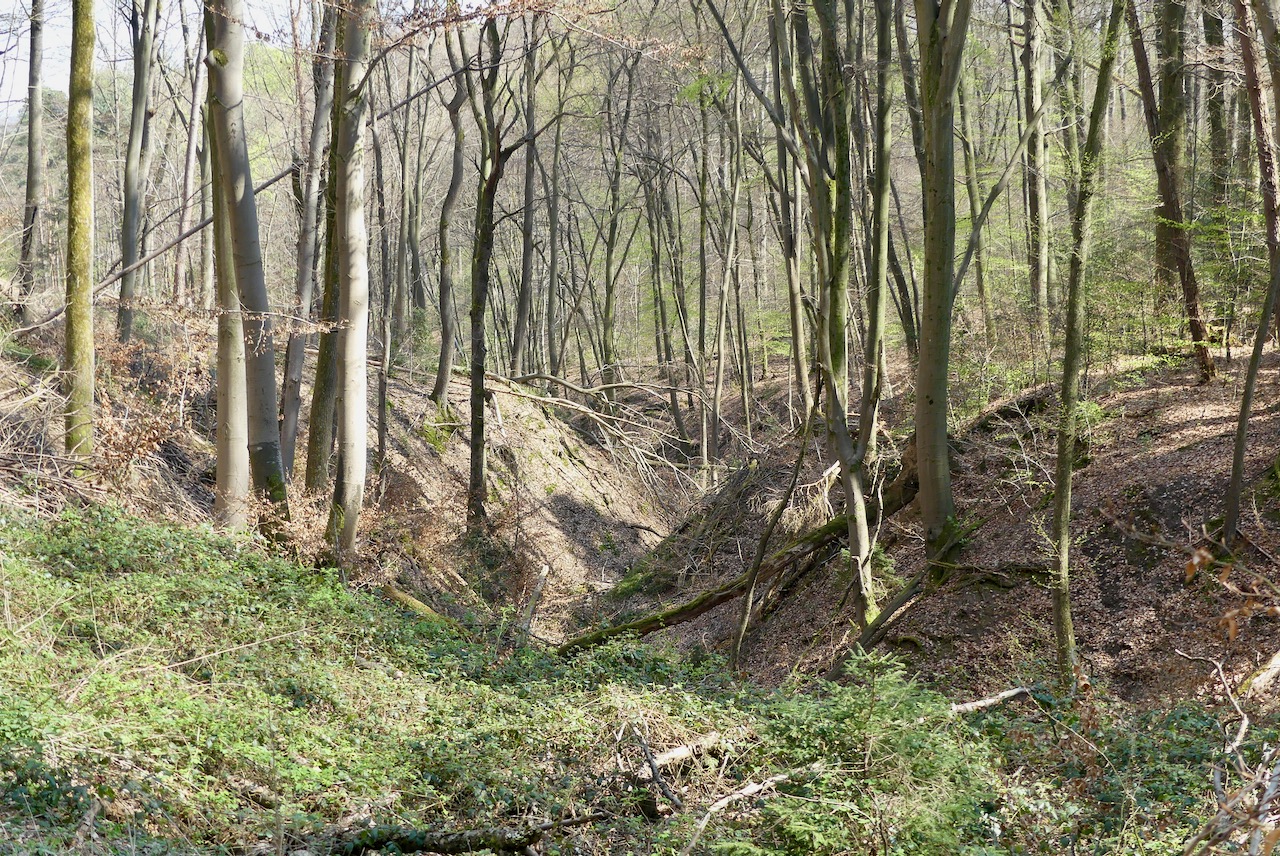 Das ist ein Bisschen seltsam hier: Links Waldschäden und Aufforstungsversuche, rechts Durcheinander und frisches Grün. Und den Ringwall habe ich verpasst. Der liegt auf der anderen Seite des Grabens.