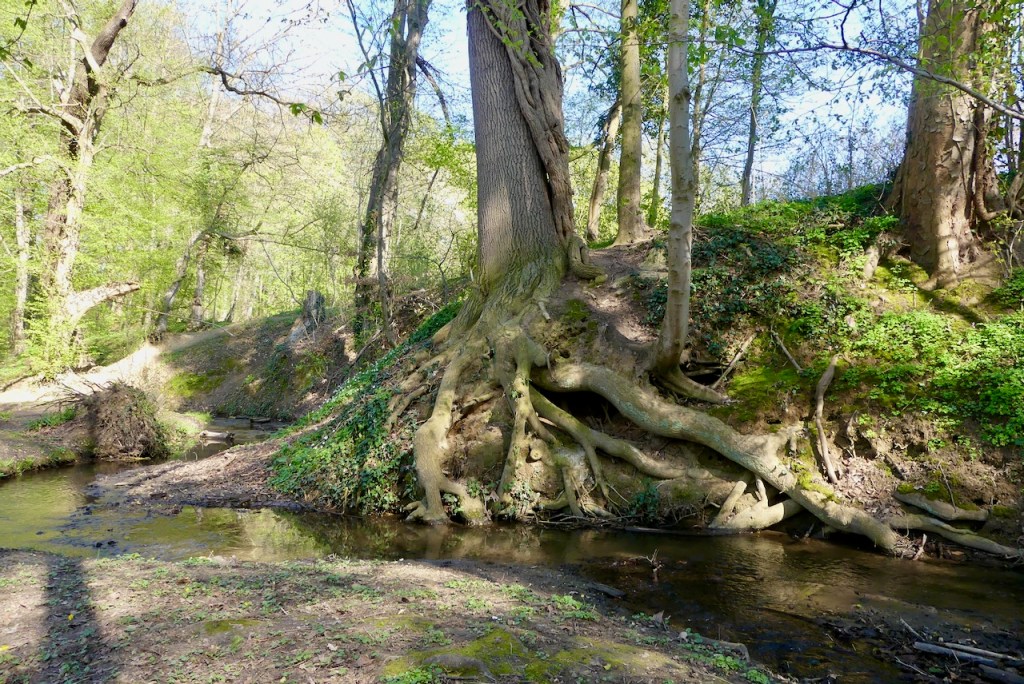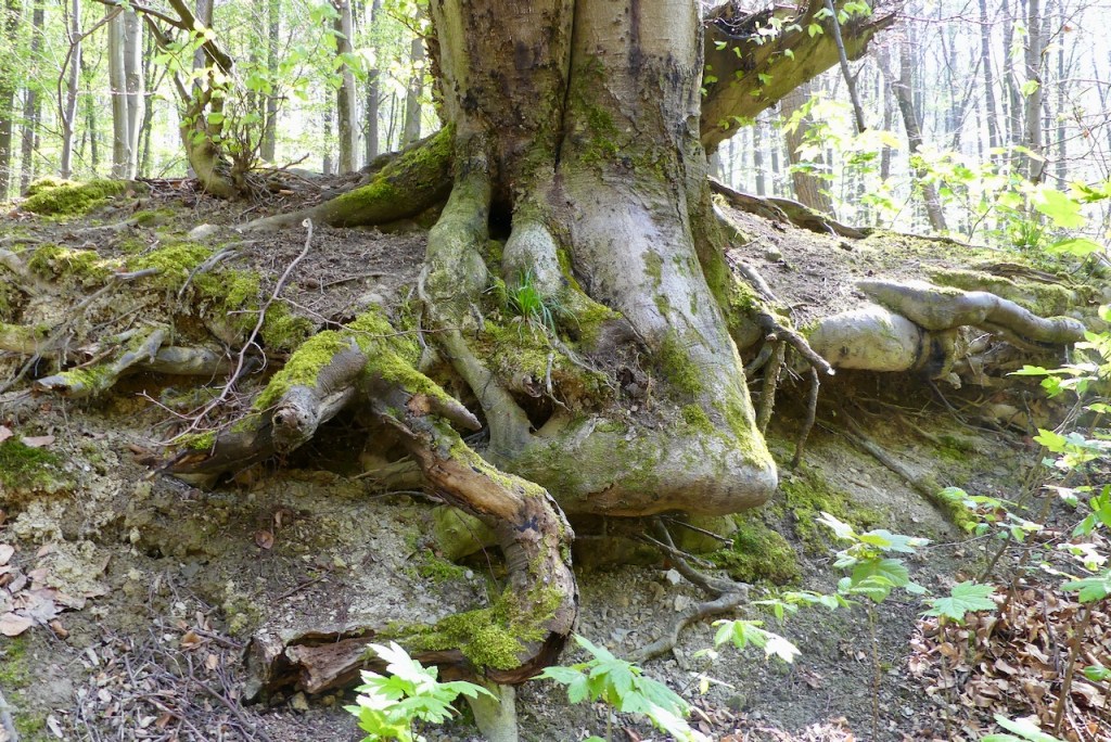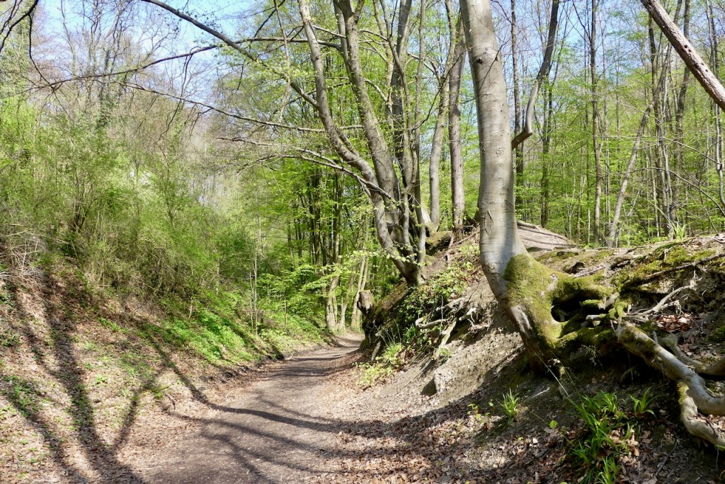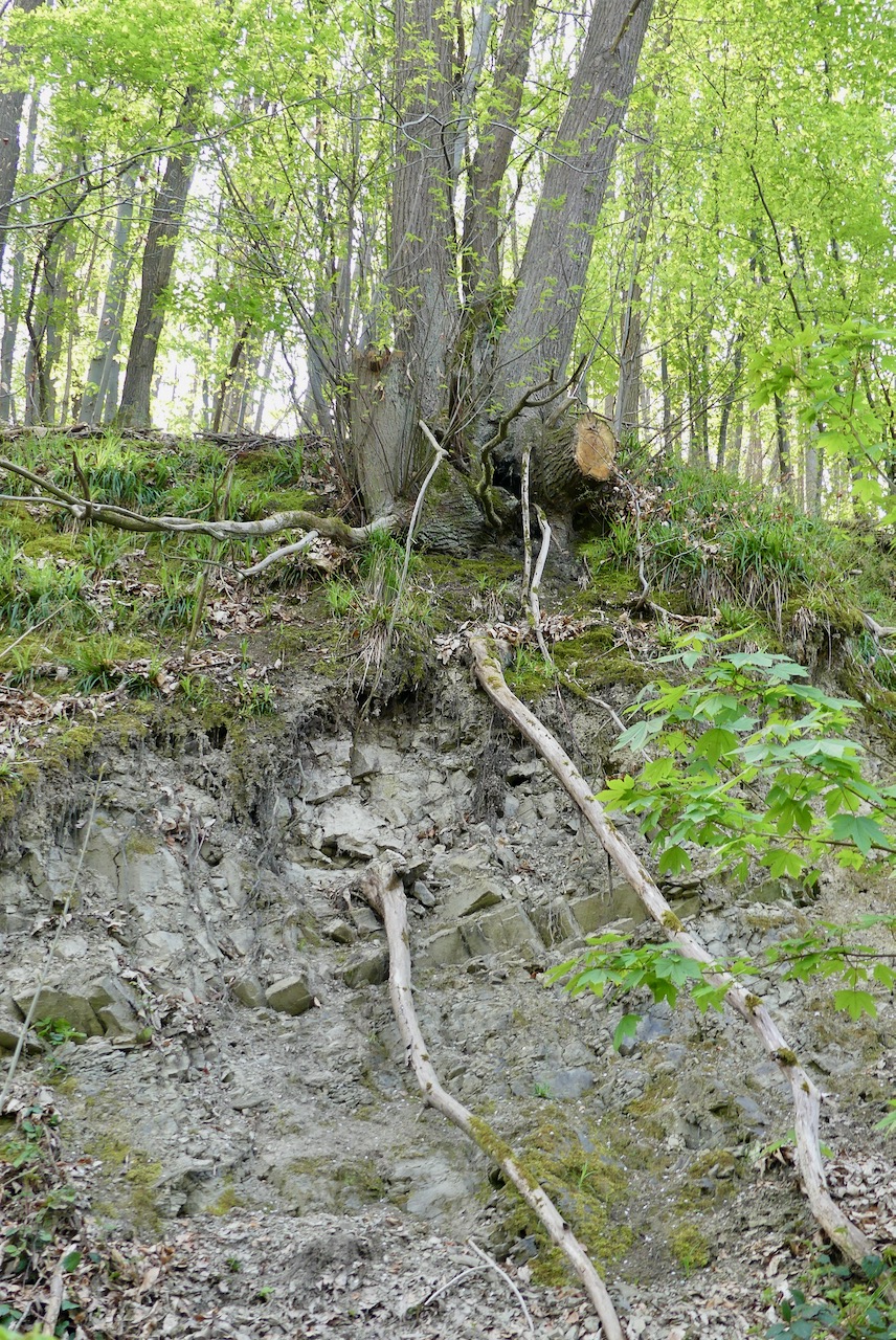Der Weg durch das tief eingeschnittene Klufterbachtal ist dann mehr nach meinem Geschmack. Die Hainbuchen schlagen gerade aus und haben auf dem Lößlehm phantasievolle Formen angenommen. Weiter unten im Tal zwängen sie sich durch Sandstein.