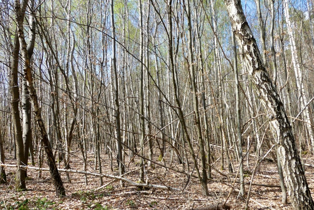 Weiter geht es immer geradeaus über das Lößplateau und die ersten Waldschäden kommen in Sicht. Man versucht der weiteren Vernässung und Versauerung des Bodens durch Aufforstung mit geeigneteren Baumarten und Abzugsgräben zu begegnen.