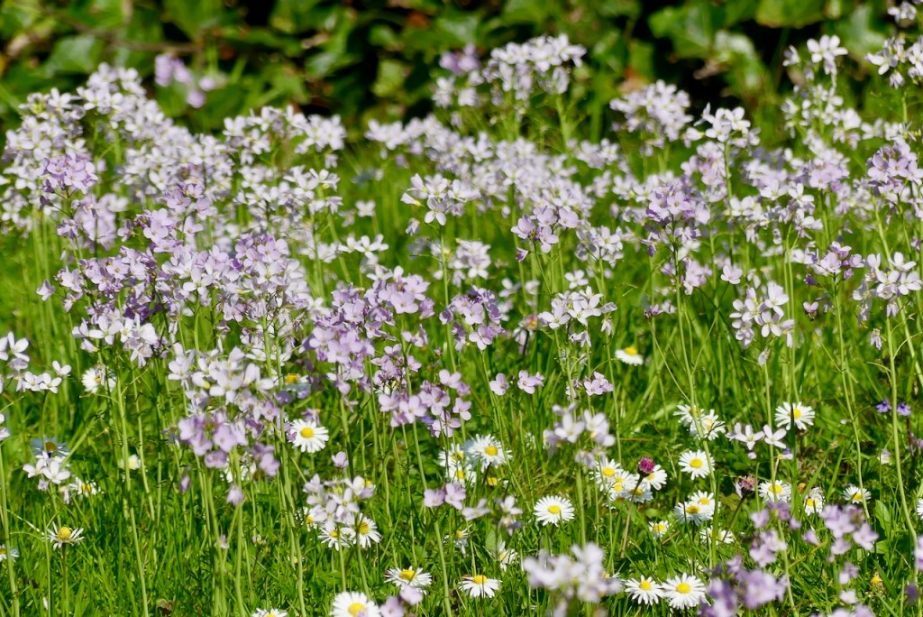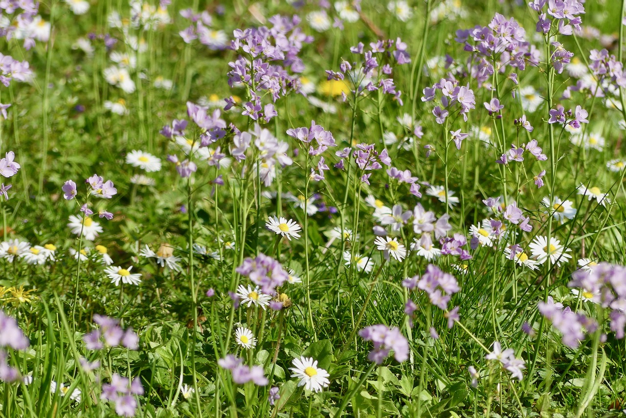 Gleich daneben ein Blütenmeer aus Wiesenschaumkraut und Gänseblümchen.