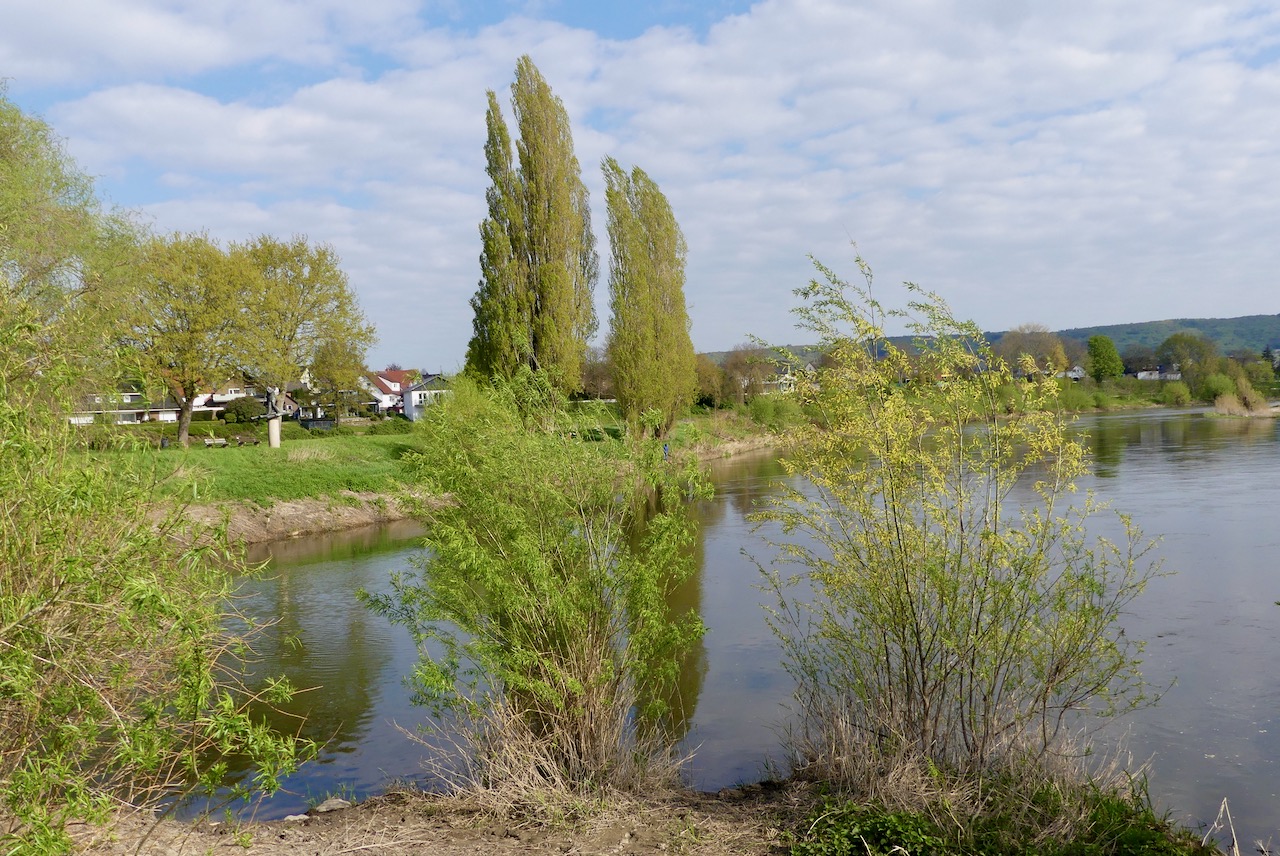 24.April Sonntag früh ist es noch frisch im Auwald der Werre. Schnell erreiche ich den Werre-Weserkuss, und die Sonne kommt raus.