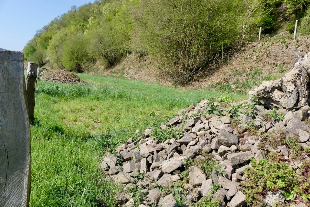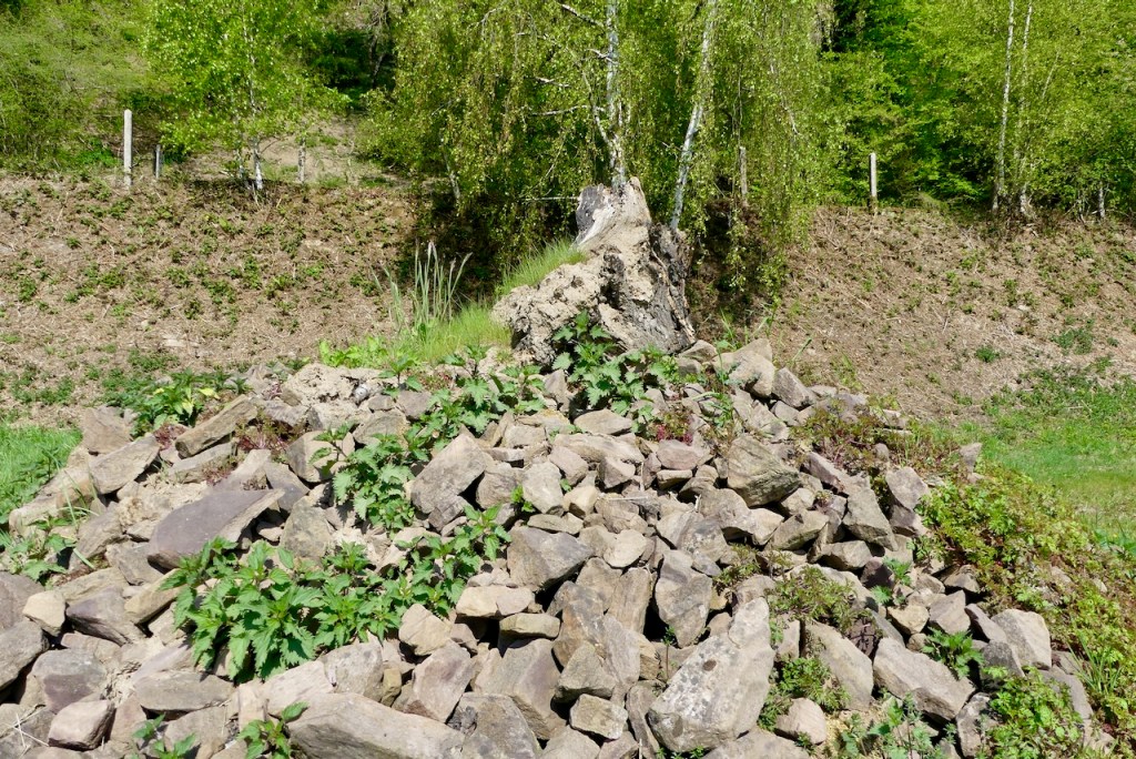 Nach dem Schreck in der Morgenstunde geht es erstmal steil bergauf, bis ich auf so etwas wie einem Bahndamm lande. Wie Perlen auf einer Schnur liegen links von mir Steinhaufen, manche auch gekrönt von einem Stück Wurzelholz. Für mich sieht das aus wie eine Maßnahme zum Reptilienschutz. Erklärt wird es aber nicht. Gleich dahinter ist ein kleiner Rastplatz.