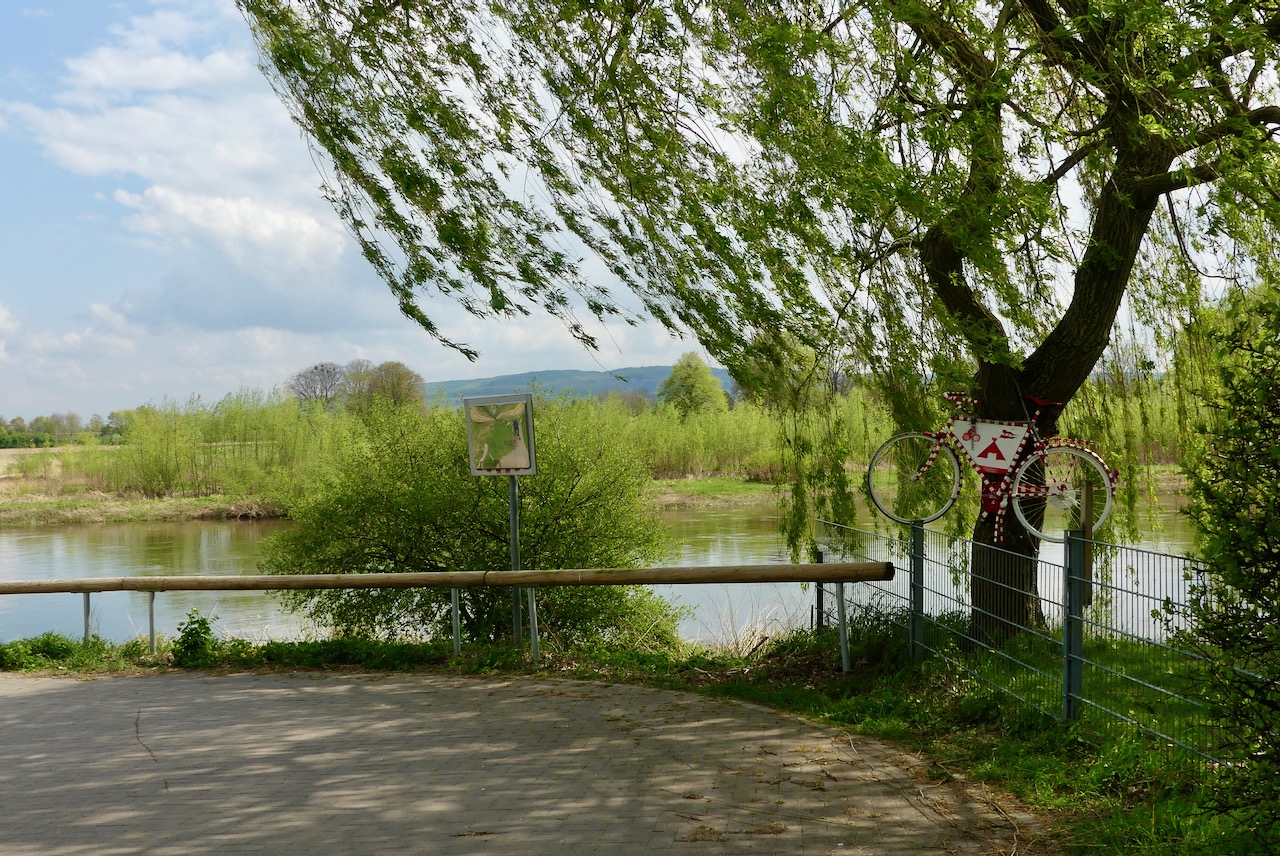 Leider fährt die Fähre gleich dahinter nicht, und so muss ich die Weser über die Autobahnbrücke queren, was ich eigentlich vermeiden wollte. Hier wird der Weserradweg nicht direkt an der Weser entlang geführt, sondern über die Dörfer und auch mal ein Stück neben der Landstraße.