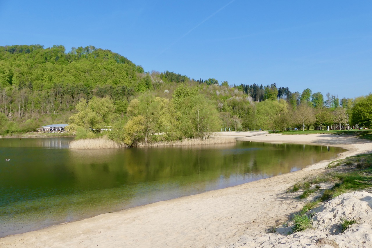 Der Gondelheimer See und das Freizeitgelände Gondelheimer Seenplatte. Der aufgeschüttete weiße Sandstrand am Gondelheimer See ist frei und kostenlos zugänglich. Auf der gegenüberliegenden Seite liegen ei paar Segelboote und ich frage mich, ob die hier nur immer auf dem See hin und her schippern. Am nächsten See liegt ein recht großer Campingplatz. Hier wurde auch mal an Menschen mit Zelt gedacht: Es gibt mehrere Schutzhütten und Grillplätze. Im Vergleich zu dem was am Rather See geplant ist, ist das Gelände riesig. Aber es gibt keine direkten Anwohner und es bleibt im wesentlichen frei zugänglich.