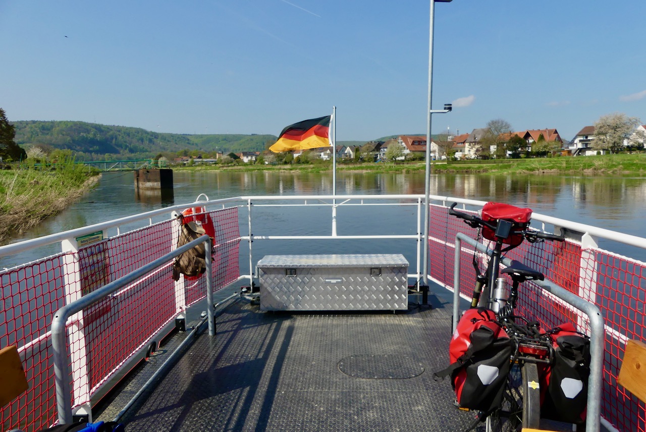 Als ich die Weser an einer Brücke über queren will kommt mir eine Frau entgegen mit der ich mich ein Weilchen unterhalte. Sie sagt mir, dass die Fähren offen sind, daher fahre ich nicht über die Brücke sondern gönne mir stattdessen eine Fahrt mit der Fähre für 1,50.